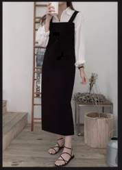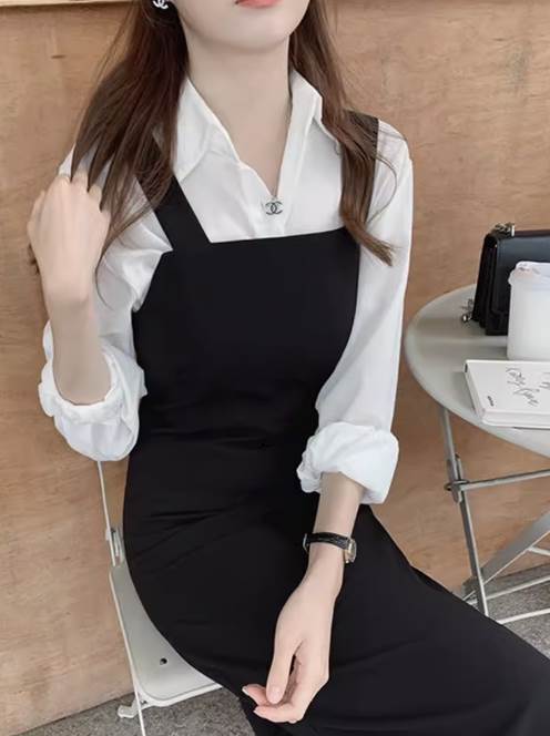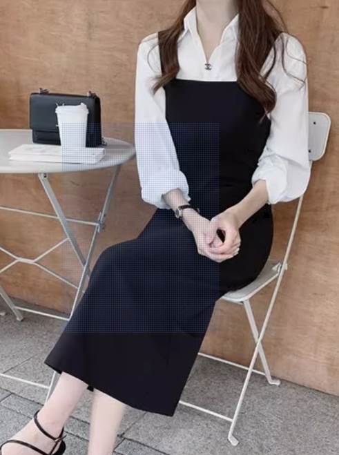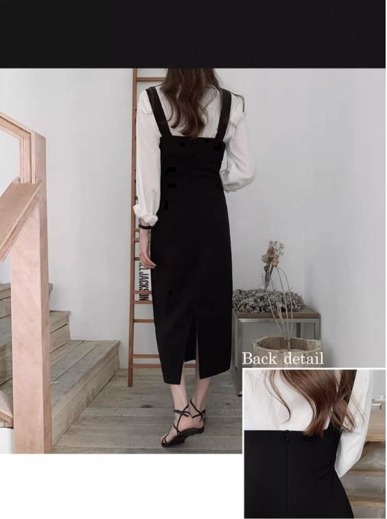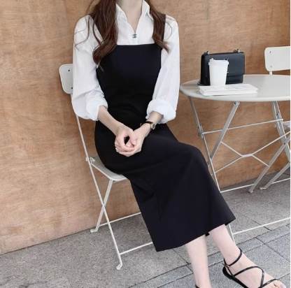 2点セット レディース シャツ ジャンパースカート 膝下 長袖 襟付き 細身 バックスリット 大人可愛い きれいめ シンプル 無地 オールシーズン ママ 学生 通学 デート お出かけ ショッピング カフェ 重ね着 コーデ 体型カバー S M L XL