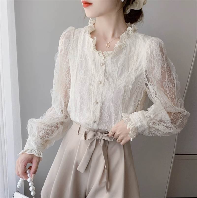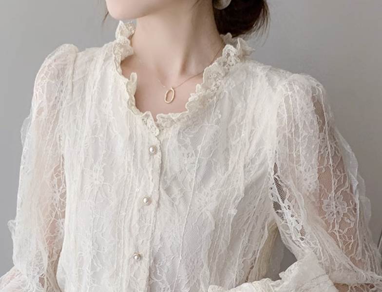 トップス シャツ 白シャツ 白トップス ミドル丈 長袖 ボリューム袖 袖透け感 スタンドカラー ストレート レース 刺繍 シフォン ボタン かわいい 大人可愛い 上品 おしゃれ メンズライク きれいめ
