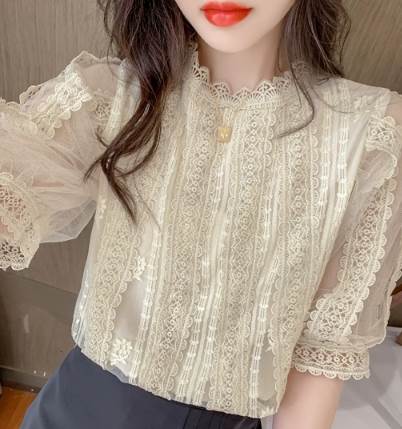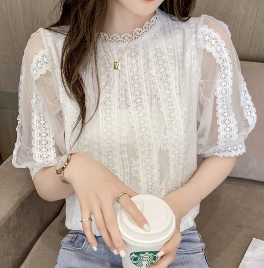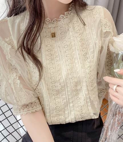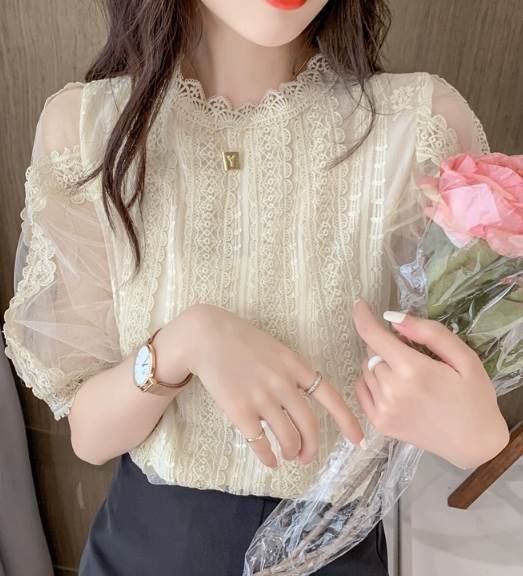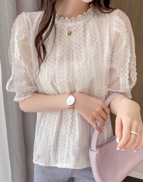 レディース トップス シャツ プルオーバー 半袖 レース袖 ハイネック レース襟 ストレート レース 刺繍 透け感 かわいい 大人可愛い きれいめ シンプル 上品 ガーリー エレガント ラブ おしゃれ