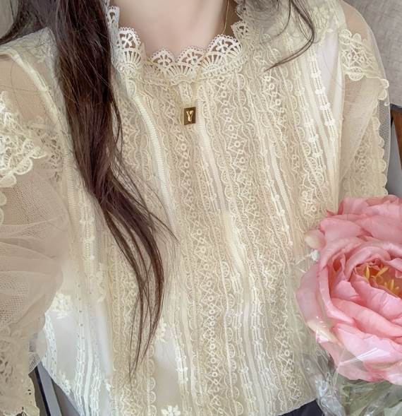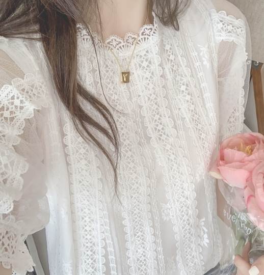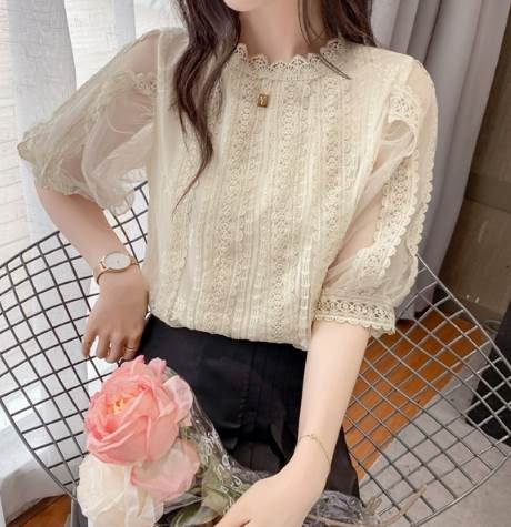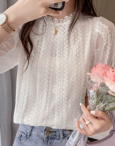 職人技が光る繊細なレースが上品でエレガントな半袖シャツ。襟と襟部分のデザインも女性らしくて可愛さ満点です。袖の程よい透け感もおしゃれ。存在感のあるトップスなのでシンプルなボトムスと相性抜群です。シックで落ち着いたブラックやブラウンのキャミワンピースを合わせてもキュート。