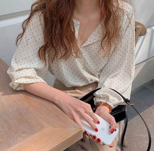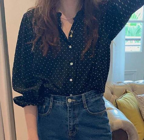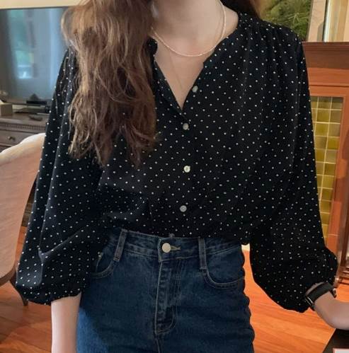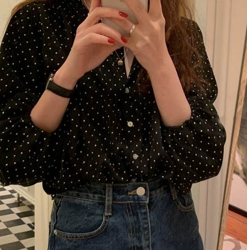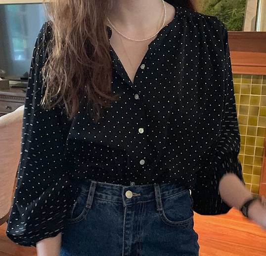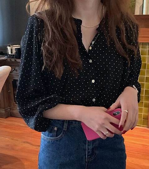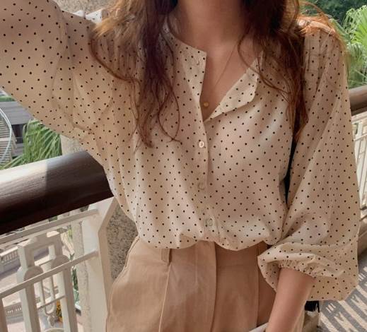 トップス シャツ ブラウス 袖あり 長袖 シフォン かわいい 大人可愛い カジュアル 上品 おしゃれ レトロ 大人女子 ラフ 抜け感 こなれ感 ドット柄 水玉 春 10代 20代 30 秋