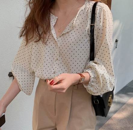 水玉模様がどこかレトロな雰囲気の大人可愛いシフォンシャツ。いくつかボタンを開けてネックレスを覗かせると可愛くなりすぎずに抜け感を演出できます。シンプルなボトムスを合わせれば甘辛コーデに、フレアスカートを合わせてガーリーに纏めても可愛いです。