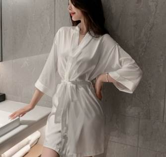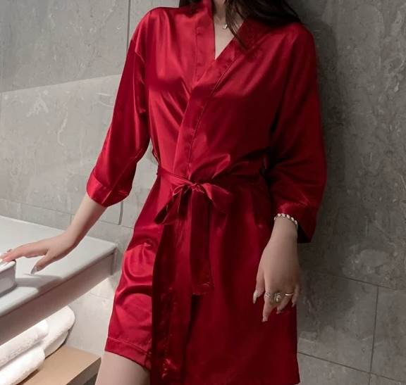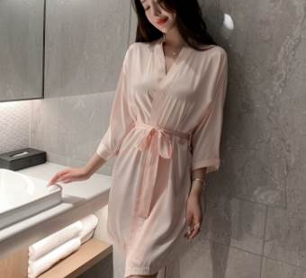 ナイトウエア ナイトガウン バスローブ パジャマ ミディアム丈 袖付き 長袖 襟なし 前開き ウエストリボン シルク かわいい 大人可愛い きれいめ シンプル カジュアル 上品 おしゃれ かっこ 大人