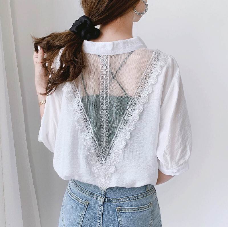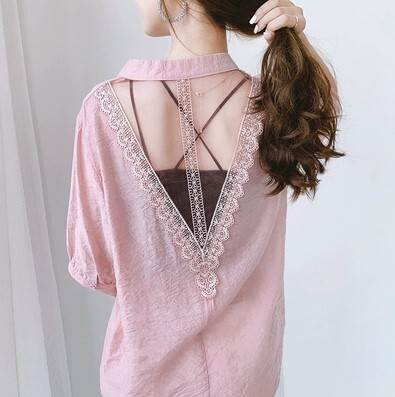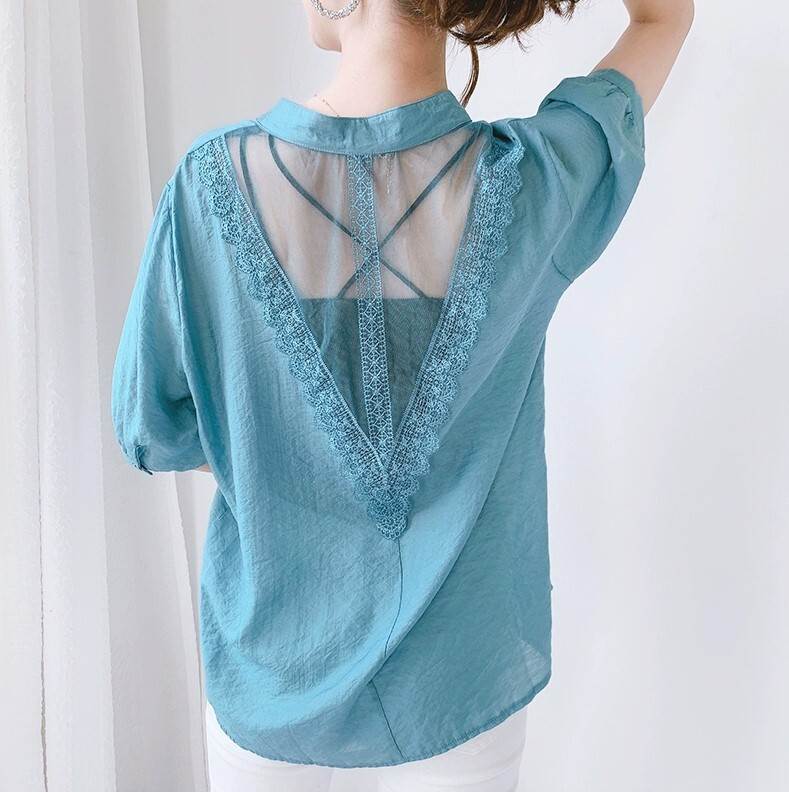 トップス ブラウス 背中 バックオープン レース 袖あり 5分袖 五分袖 Vネック スタンドカラー 透け感 シースルー 薄手 かわいい 可愛い きれいめ 大人 上品 おしゃれ お洒落 かっこいい 大人可愛い 大人女子 こなれ感 ラブリー キュート ガーリー 個性的 クール セクシー エレガント 抜け感 無地 春 夏 秋 10代 20代 30代 40代 50代 60代 レディース 女性用 デート お出かけ 休日 パーティー イベント モテ トレンド 流行 S M L XL ホワイト 白 ピンク ブルー 青