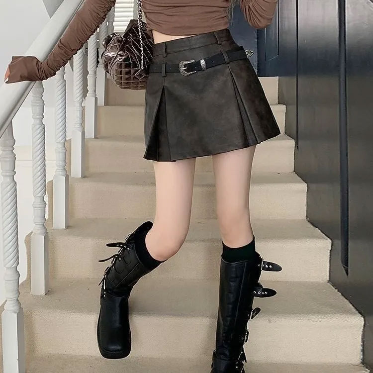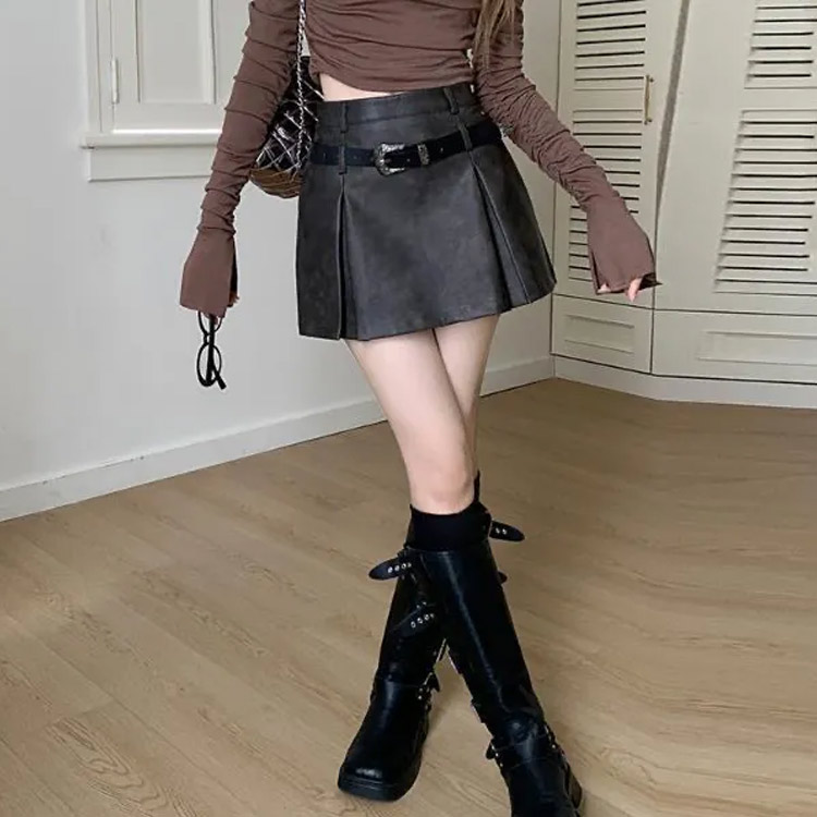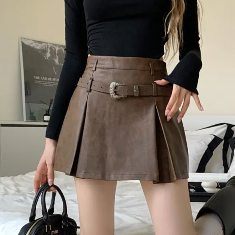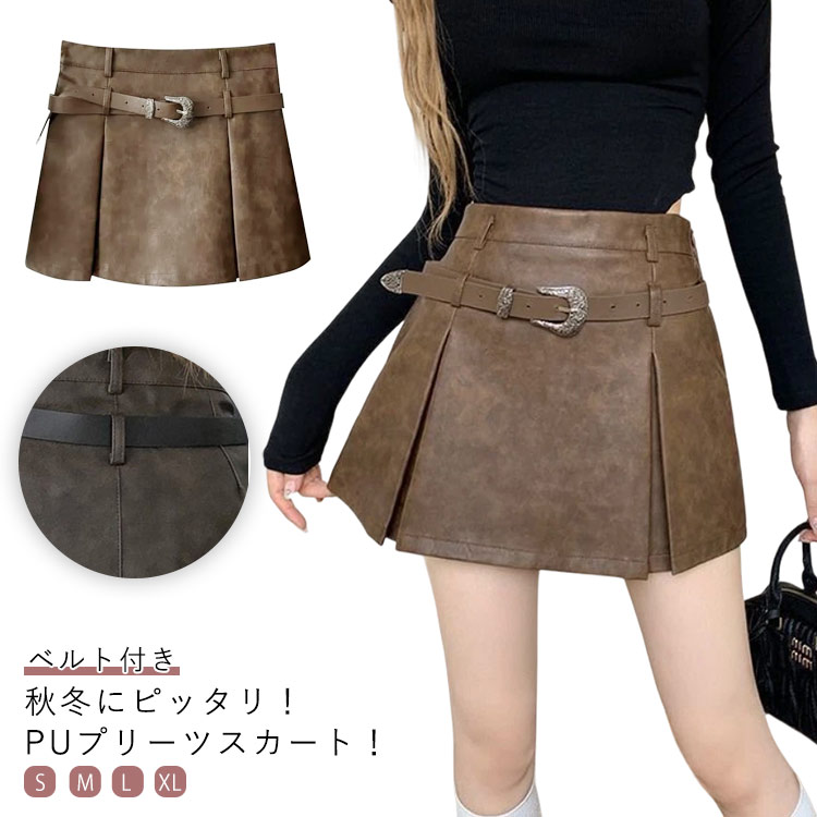 プリーツスカート ハイウエスト ミニス レディースファッション 人気 ベルト付き/コーヒー ベルト付き/ブラック S M L XL
