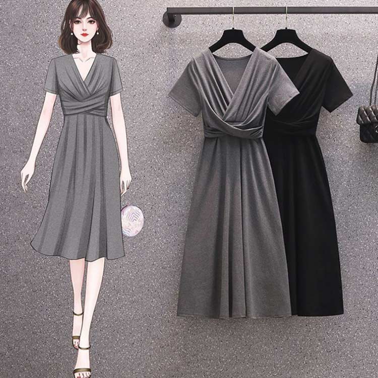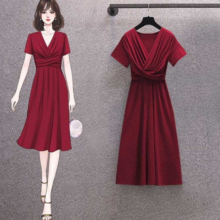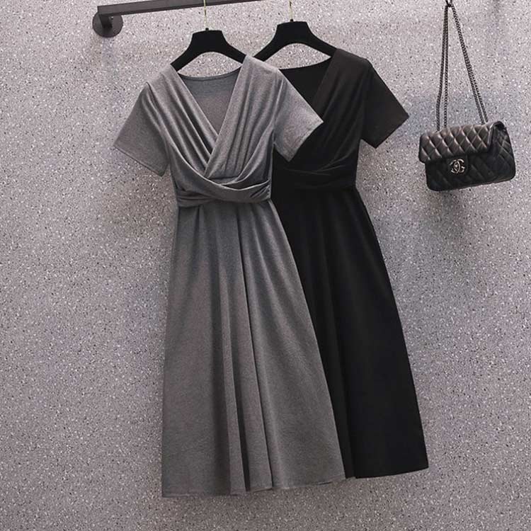 Vネック ひざ丈 半袖 おしゃれ ワン ワンピース 続々登場 ブラック レッド グレー ダークグリーン M L XL 2XL 3XL 4XL