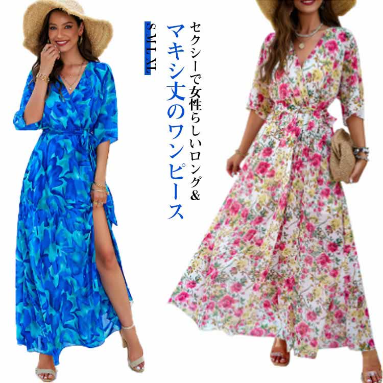 お出かけ 花柄 マキシワンピース フェ ワンピース 42%Off ホワイト ダークブルー ピンク ライトブルー S M L XL