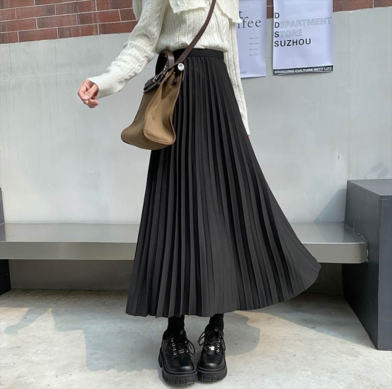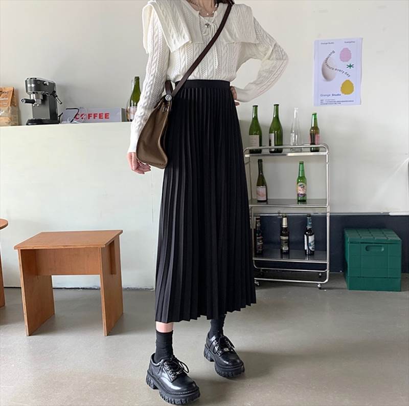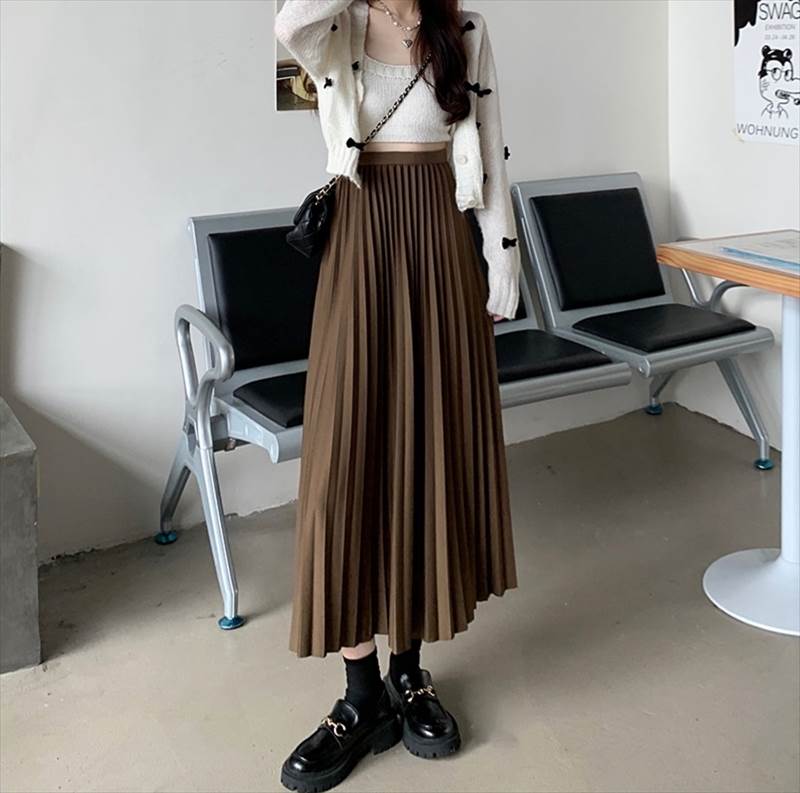 歩くたびに揺れるプリーツが女性らしいミモレ丈プリーツスカート。