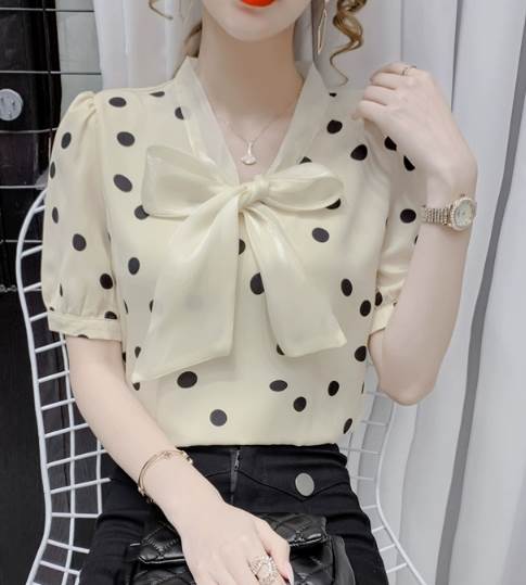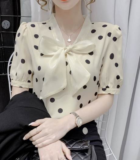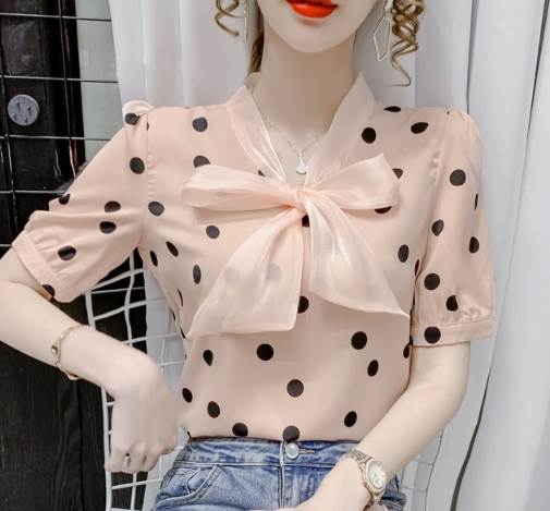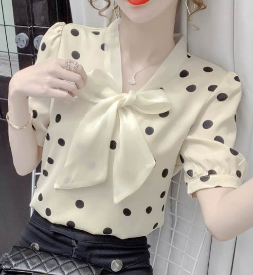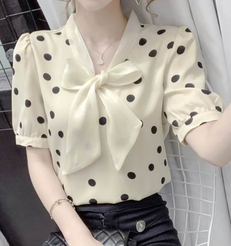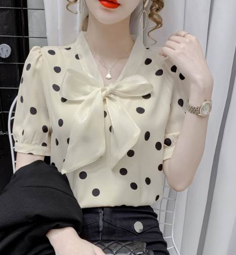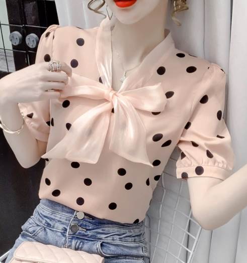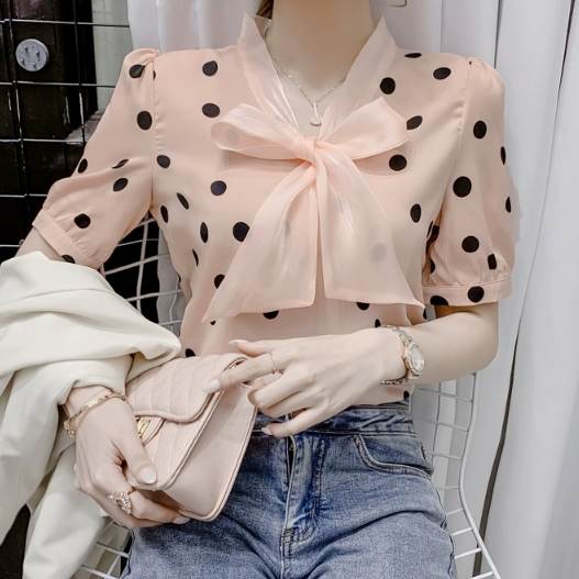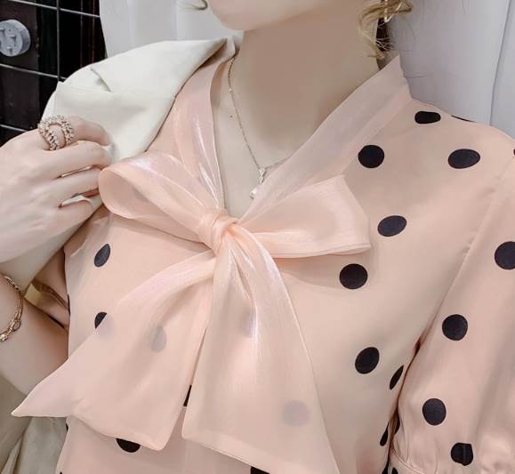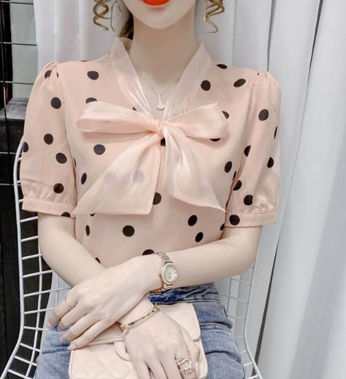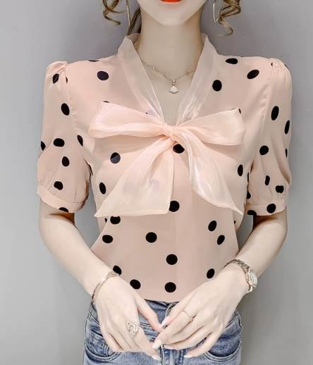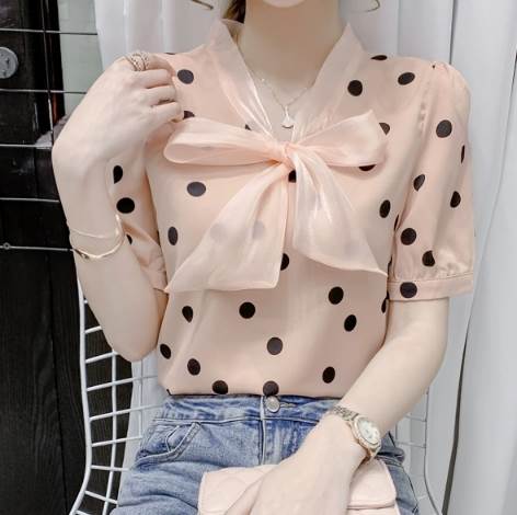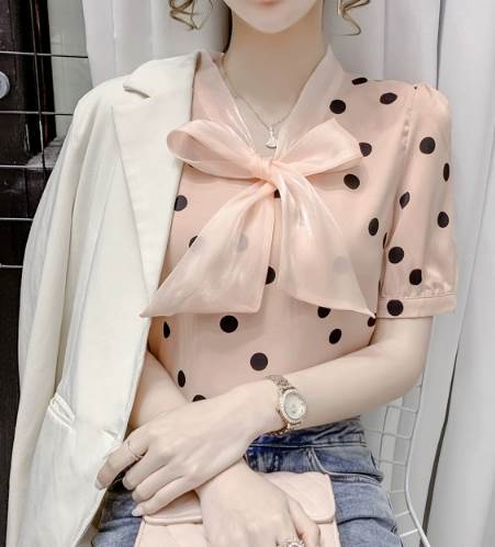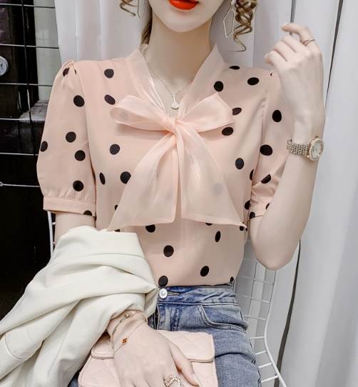 レディース トップス シャツ プルオーバー 半袖 Vネック 襟なし ボウタイ ストレート シフォン リボン かわいい 大人可愛い きれいめ カジュアル 上品 おしゃれ レトロ ガーリー エレガント 存在感 ラブリー キュート クラシカル シック 涼しげ 水玉 夏 10代 20代 30代 デート お出かけ イベント 旅行 海 レストラン 女子会 休日 ショッピング コンサート ライブ カフェ 食べ歩き テーマパーク 遊園地 普段使い 着回し モテ 清楚 S M L XL 2XL ピンク アプリコット