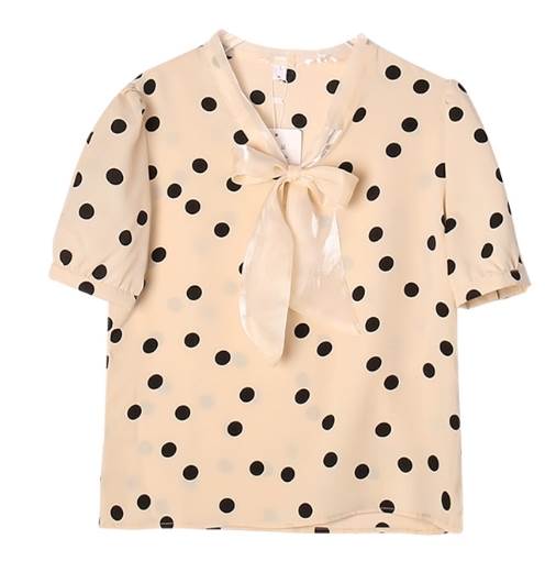 レトロな水玉模様とデコルテ部分を飾る大きなリボンが可愛い半袖シャツ。女性らしい柔らかくて優しいアプリコットカラーとピンクの二色をご用意しました。幼く見えない大人可愛い色味が魅力的です。甘くなりすぎないようにボトムスにはシックな色のアイテムを。足元にヒールのある靴を持ってくるとコーディネートが締まります。