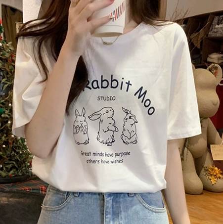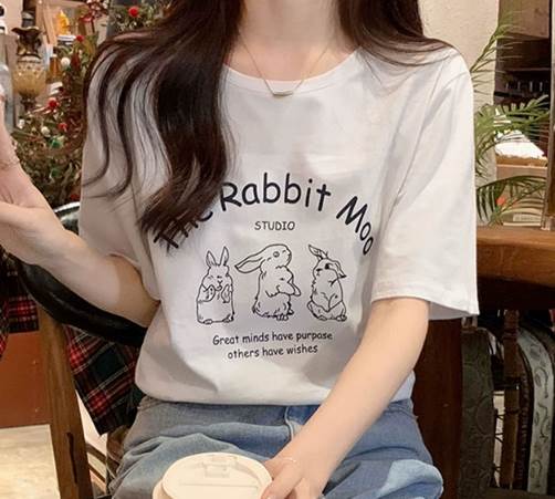 ずっと見つめていたくなるほど可愛いうさぎ柄が印象的な半袖Tシャツ。丸みを帯びた字体のロゴもとってもキュートです。柄を強調させるにはトップスインして着るのがおすすめ。シンプルなジーンズやシフォンスカートと相性抜群です。