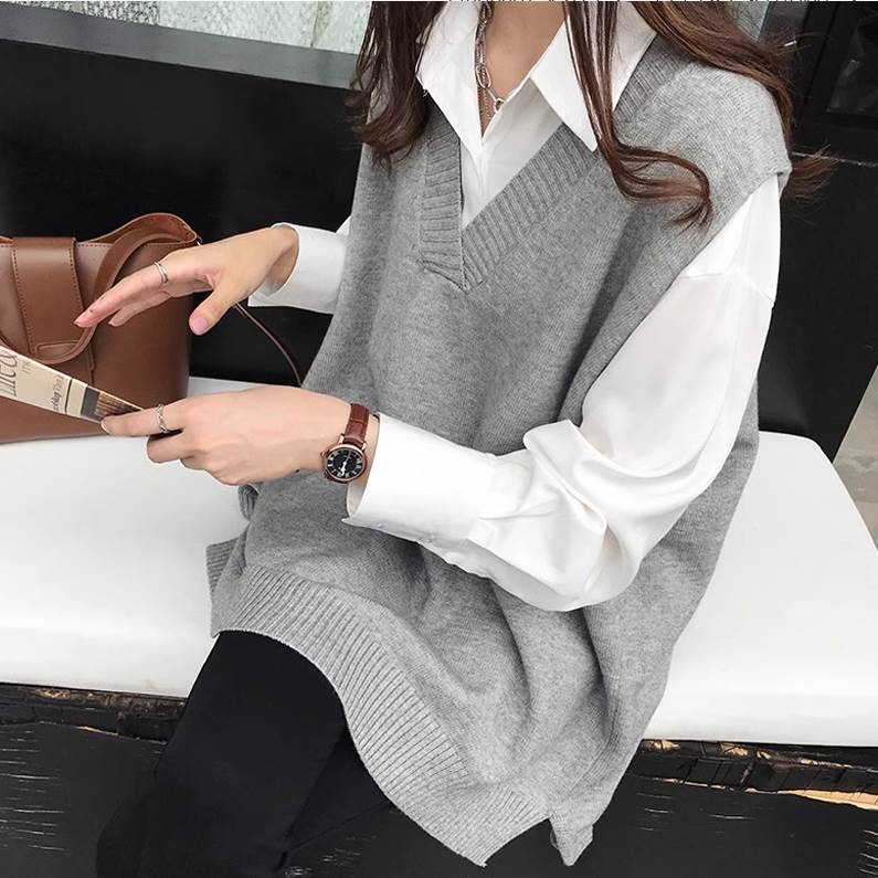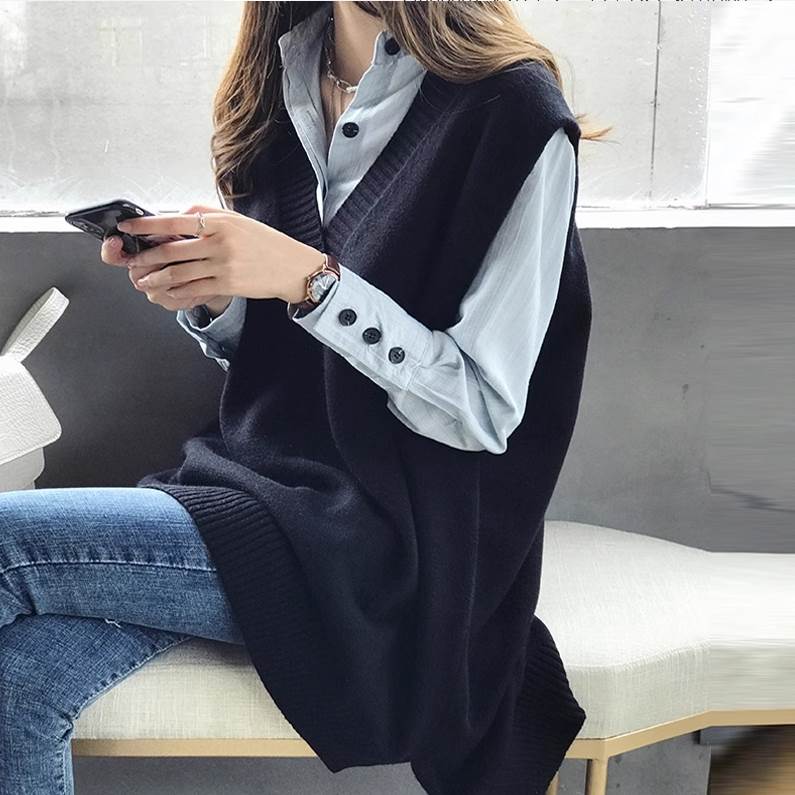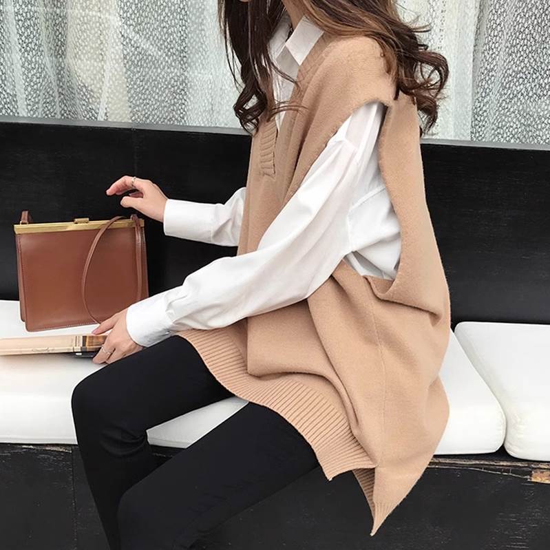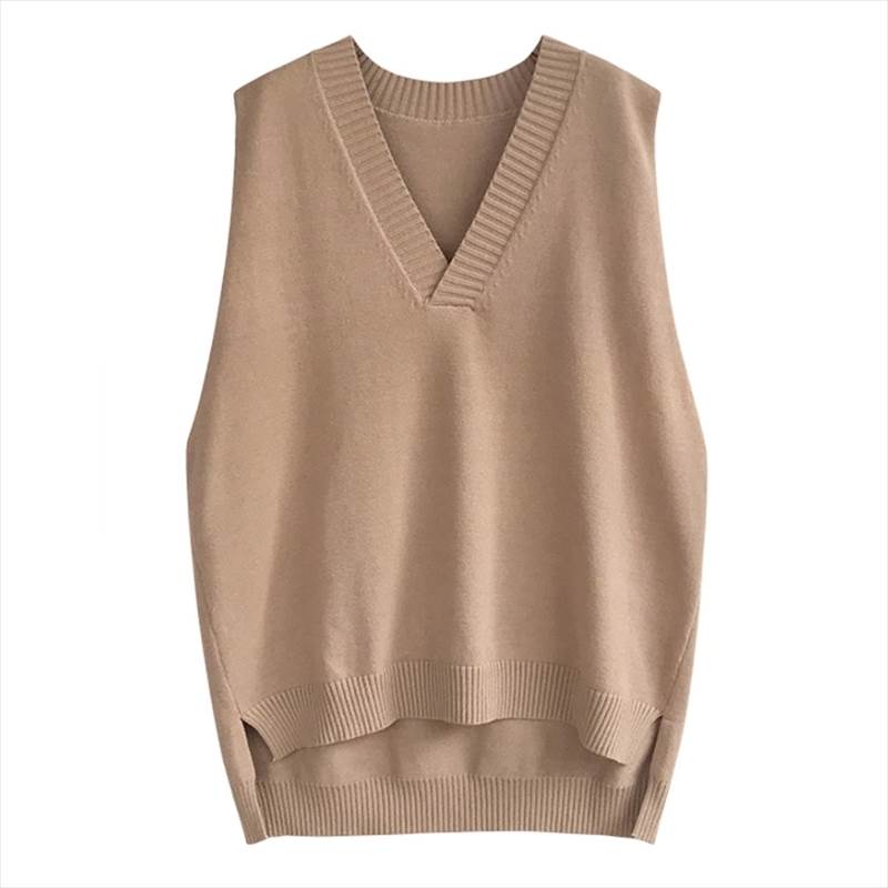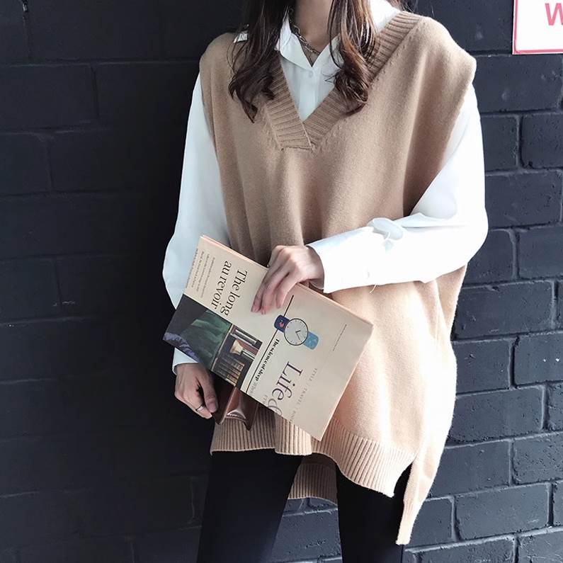 こちらのトップスは、袖なしのベストタイプで、Vネック&襟なしなので、上品な雰囲気とカジュアルな雰囲気を両立させた一枚です。ざっくりとしたワイドシルエットで、体型カバーにもぴったり。黒、灰色、キャメル、ネイビー、の4色を用意しており、秋冬カラーから定番カラーまで、様々なスタイリングに合わせられます。