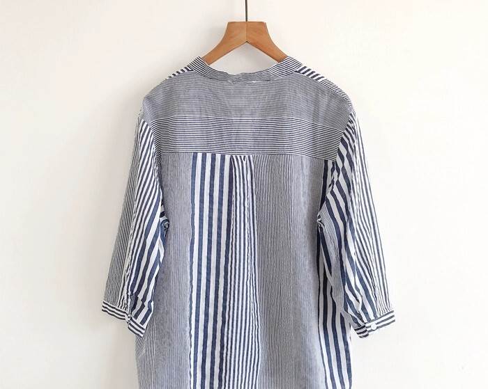 トップス シャツ ストライプ スタンドカラー 7分袖 ワイド かわいい シンプル カジュアル 大人 上品 おしゃれ こなれ感 ラフ クール 抜け感 春 夏 秋 前開き ボタン ストレート レディース