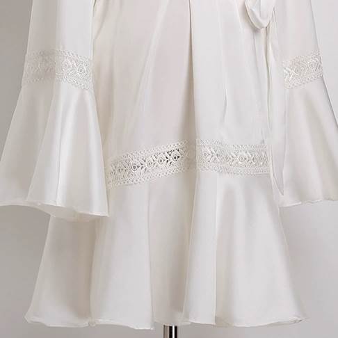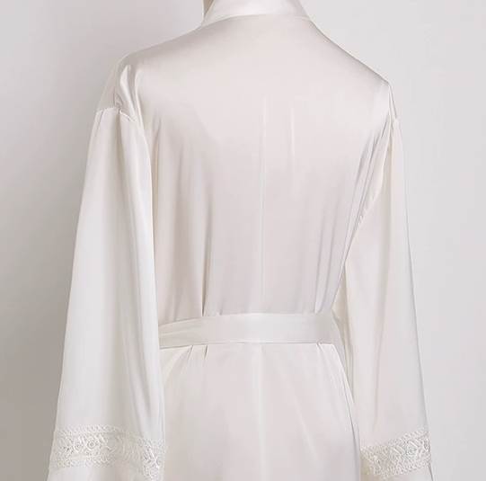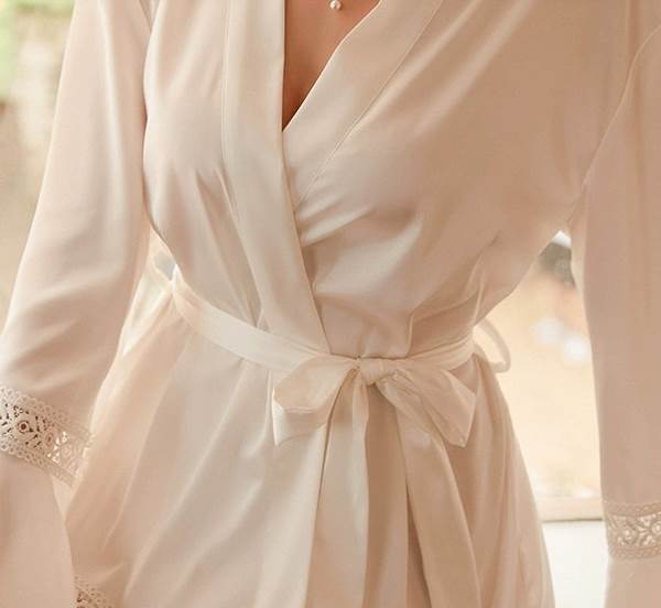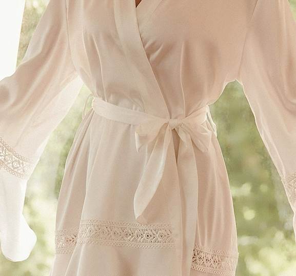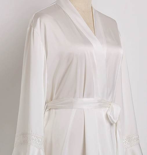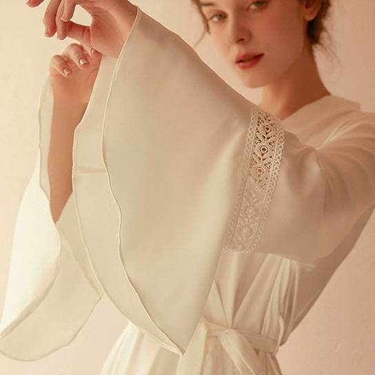 ナイトウエア ナイトガウン バスローブ パジャマ ミディアム丈 袖付き 長袖 ベルスリーブ 襟なし 前開き ウエストリボン シルク 刺 かわいい 大人可愛い きれいめ カジュアル 大人 上 シンプル
