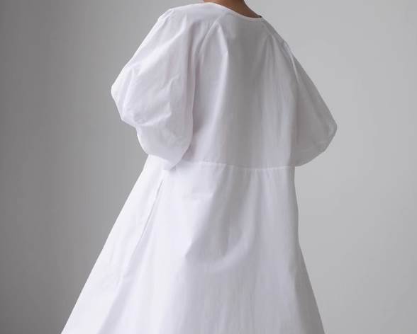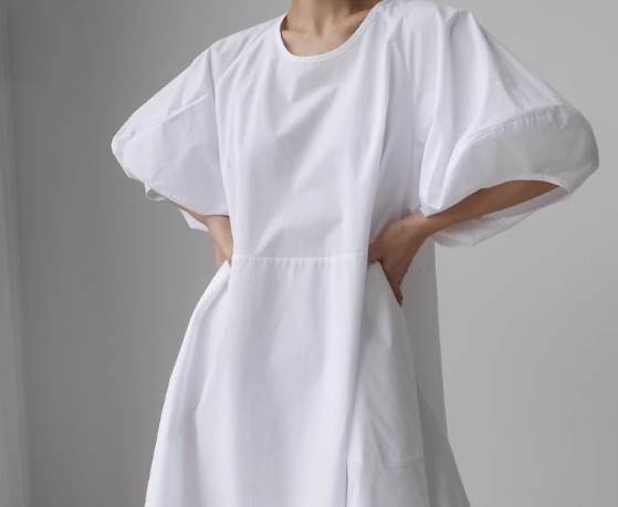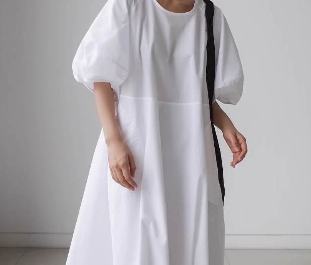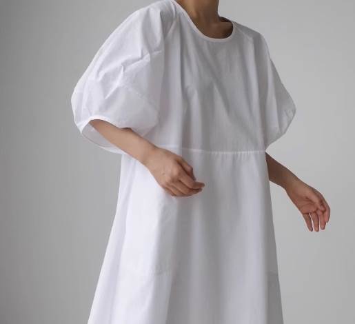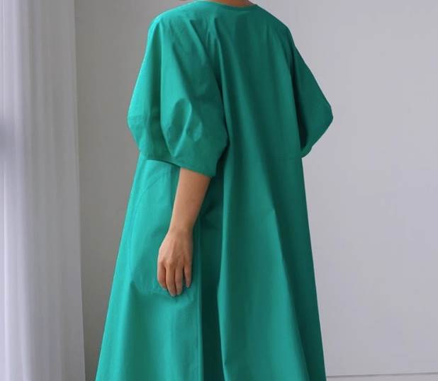 ボリュームのある半袖とフレアシルエットが女性らしさを引き立てます。