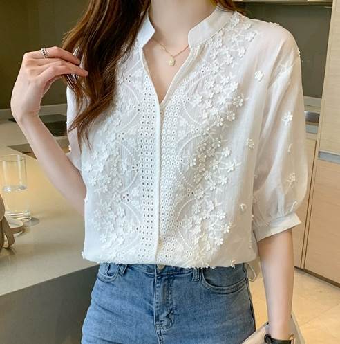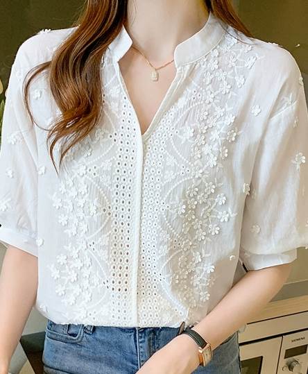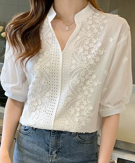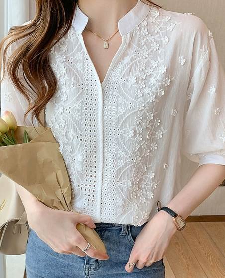 レディース トップス プルオーバー 5分袖 パフスリーブ Vネック ストレート 刺繍 かわいい 大人可愛い きれいめ カジュアル 上品 ガーリー エレガント 存在感 ラブリー キュート 清潔感 爽やか 高級感 芸術的 無地 花柄 フラワー 春 夏 20代 30代 40代 オフィス OL 通勤 デート お出かけ イベント 旅行 海 レストラン 女子会 休日 高原 ガーデン ショッピング お花見 カフェ 楽ちん 普段使い 着回し モテ 清楚 S M L XL 2XL 白 ホワイト