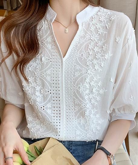 職人技が光る繊細で上品な花模様の刺繍がエレガントな五分袖シャツ。すっきりと開いたVネックはネックレスとの相性が抜群です。涼しげな生地が春から夏にかけての時期にぴったりです。存在感のある一枚なので無地のボトムスと相性抜群。ガーリーで大人可愛いくすみピンクや爽やかなブルー系を合わせても可愛いです。