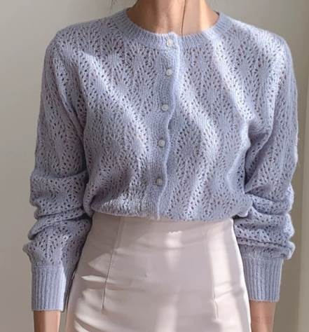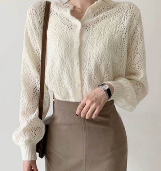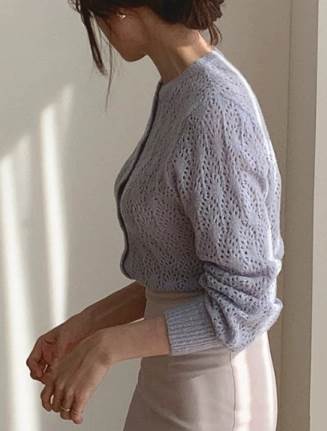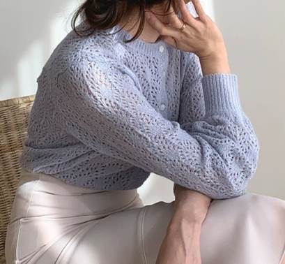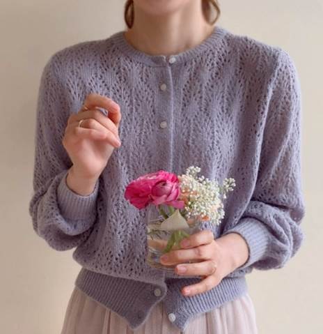 透かし編みデザインが可愛い上品なカーディガン。女性らしい優しい色味が柔らかい印象にしてくれます。少し短めの丈なのでハイウエストのスカートやパンツと相性抜群。プリーツスカートや柄物のスカートともよく合います。