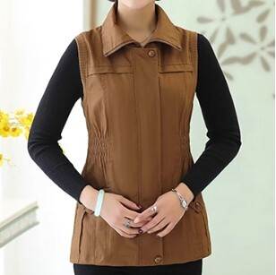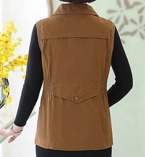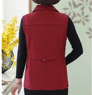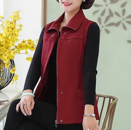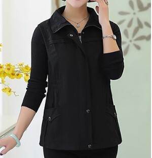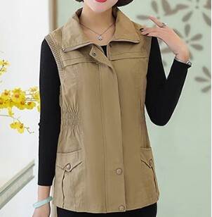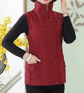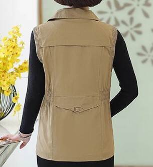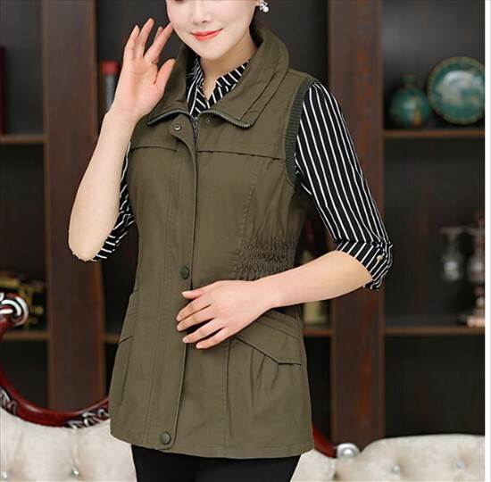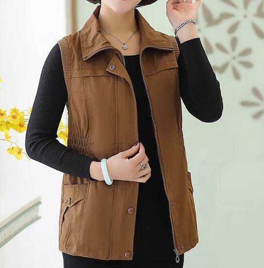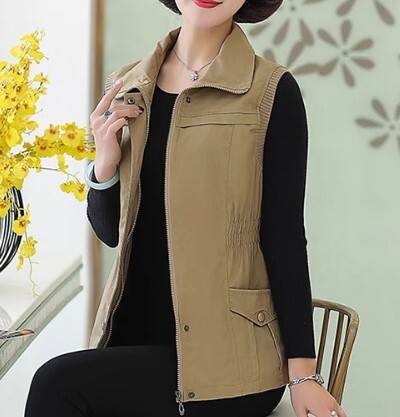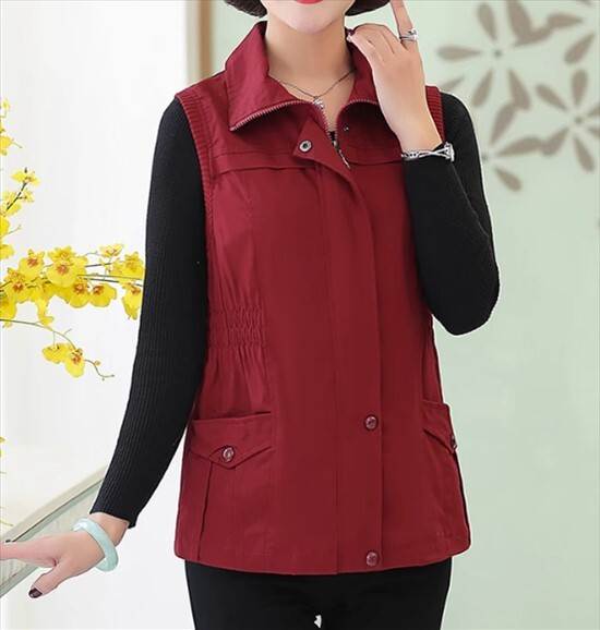 アウター トップス ベスト ジャケット チョッキ スタンドカラー ポロ襟 ウエストシャーリング ミドル丈 袖なし ノースリーブ 薄手 前開き ボタン ジッパー 切り替えデザイン 母親 中高年 カ 春秋