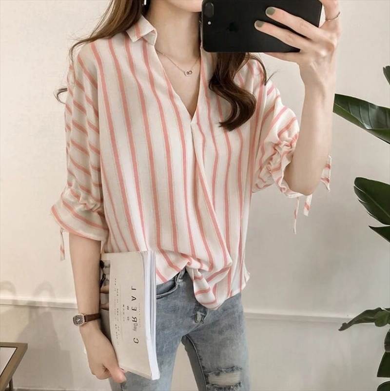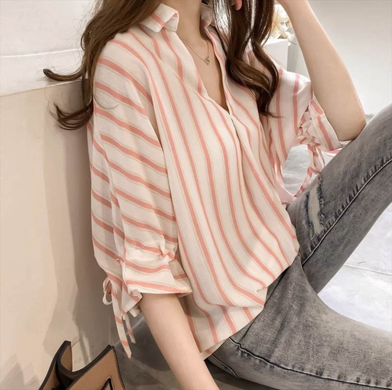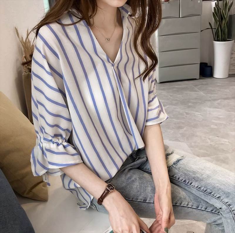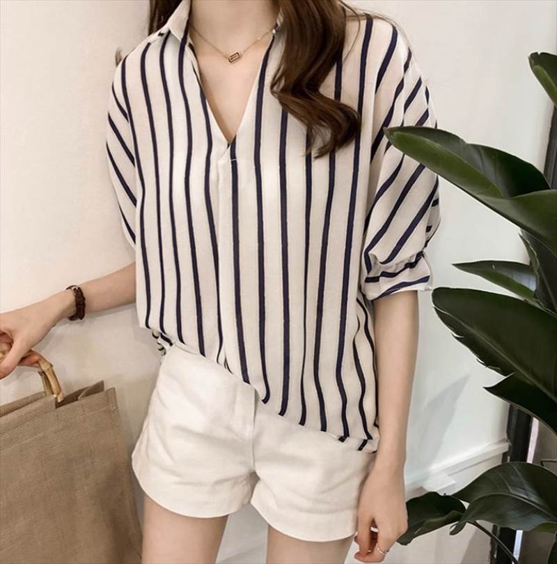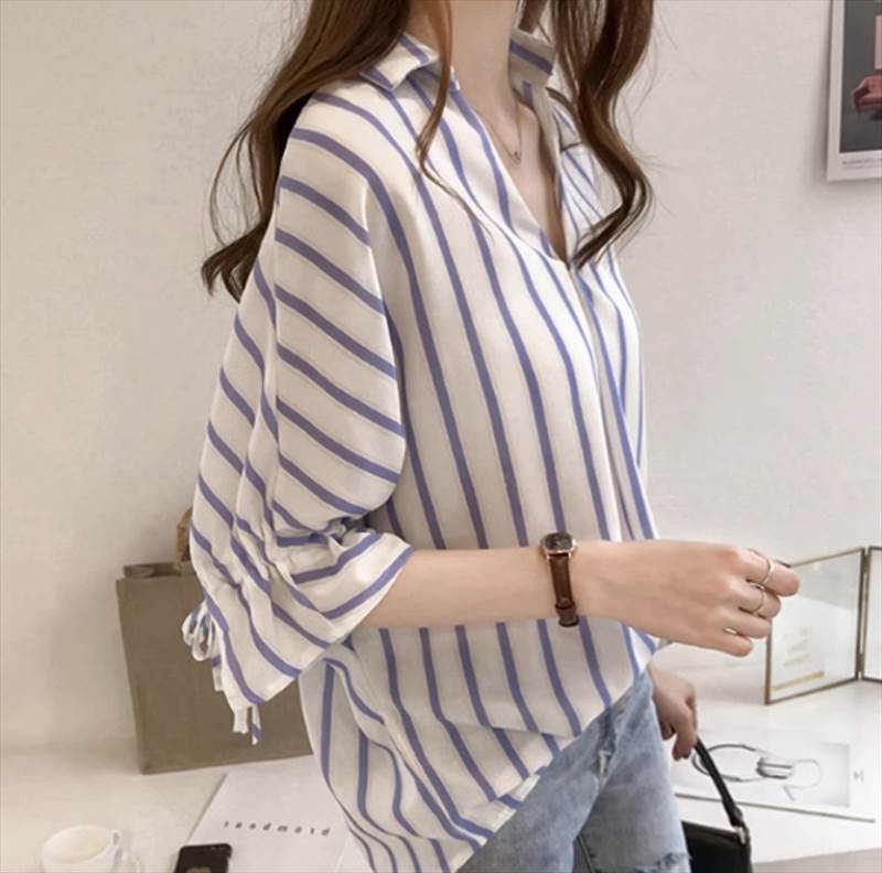 トップス シャツ ミドル丈 半袖 Vネック 襟付き ストレート かわいい 大人可愛い きれいめ シンプル カジュアル 上品 大人 おしゃれ メンズライク クール ストライプ 10代 20代 30代 夏