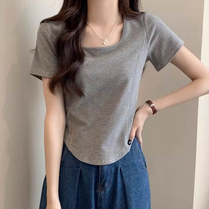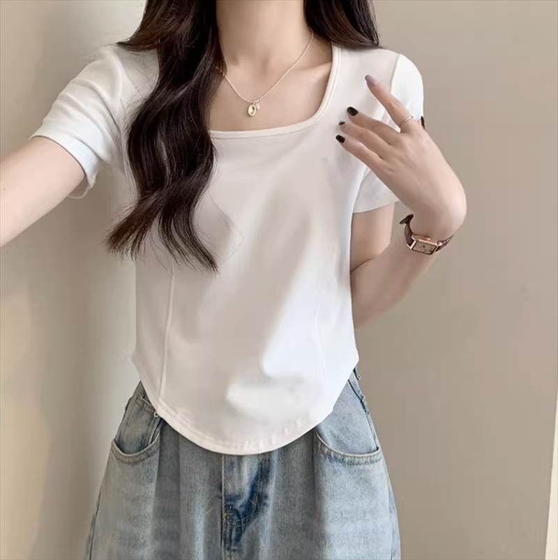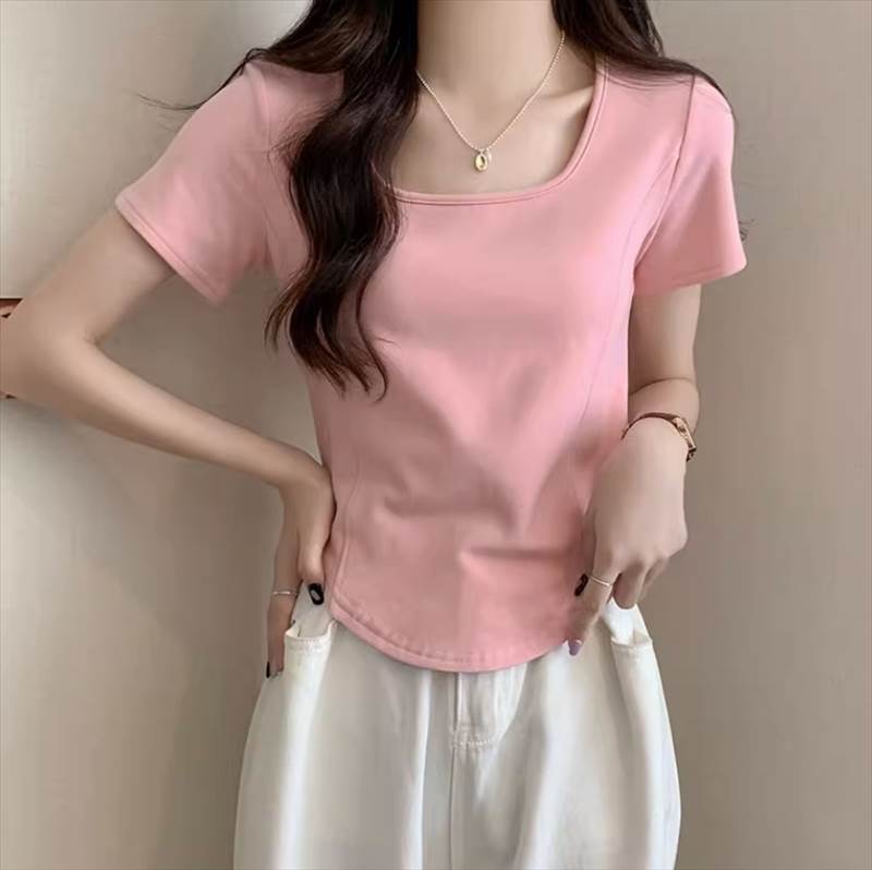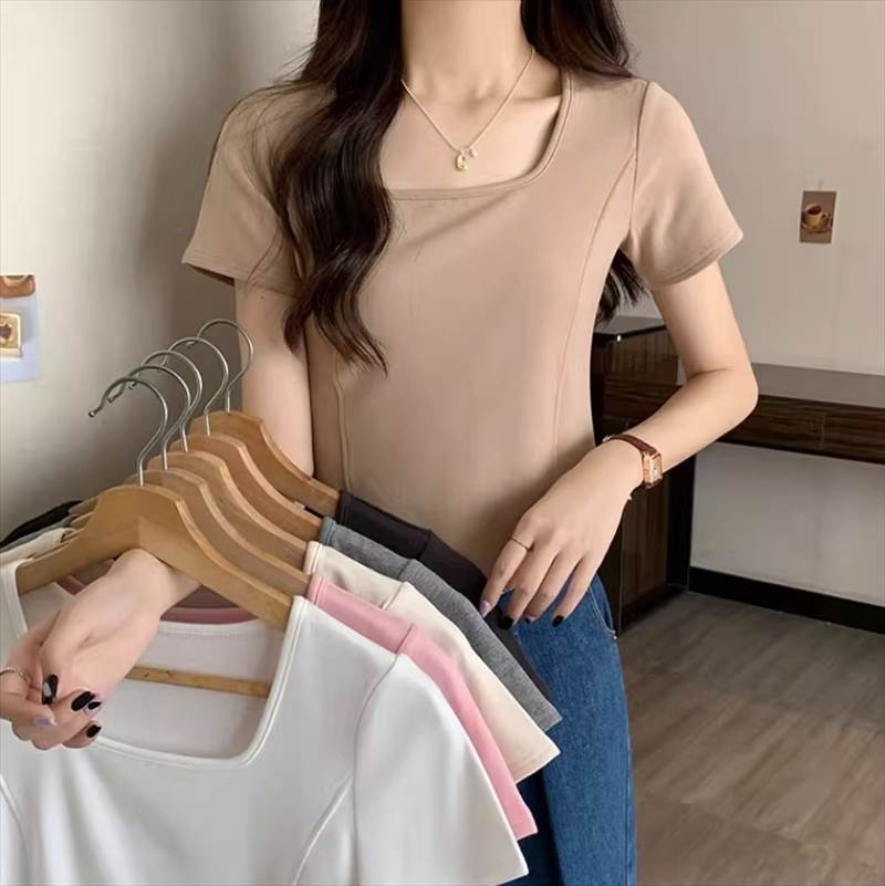 レディース トップス Tシャツ ショート 半袖 スクエアネック タイト スリム 細身 かわいい 大人可愛い きれいめ シンプル カジュアル ガーリー クール 無地 夏 学生 デート お出かけ 休 学校