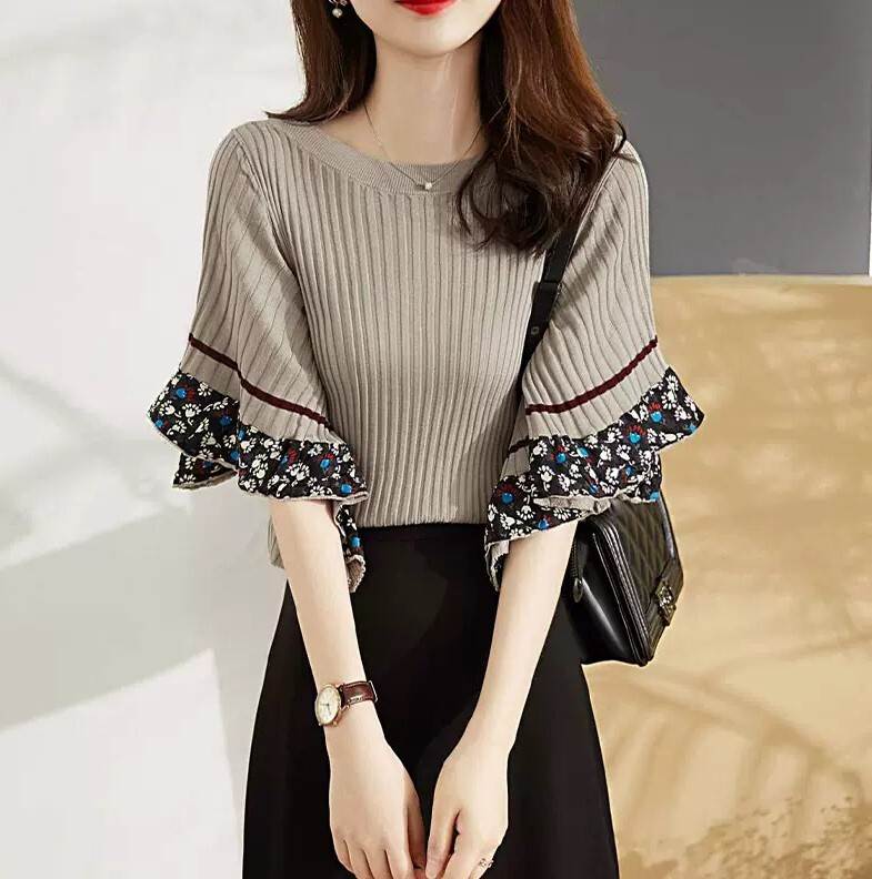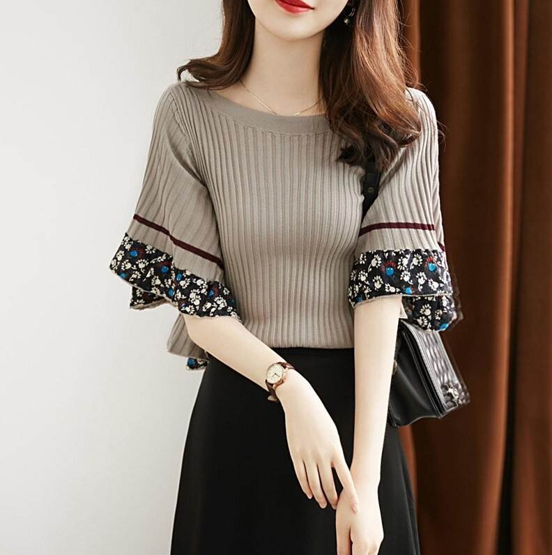 トップス ニット フリル袖 花柄 5分袖 Uネック スリム かわいい きれいめ 大人 上品 おしゃれ レトロ こなれ感 個性的 エレガント レディース プルオーバー ミディアム丈 灰 大き ストレート