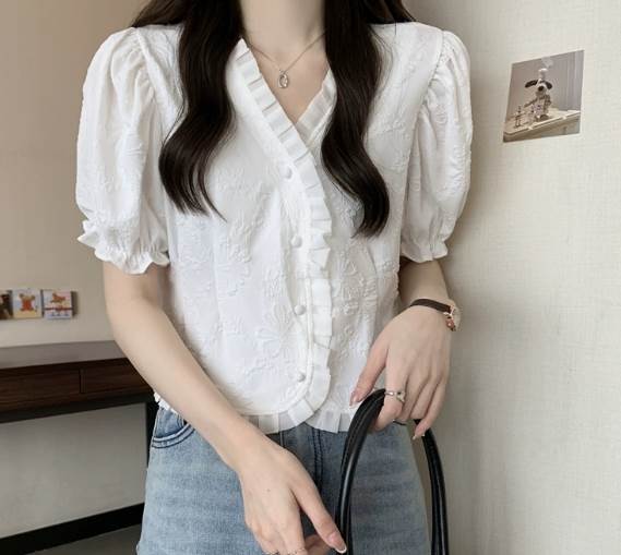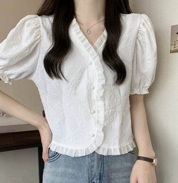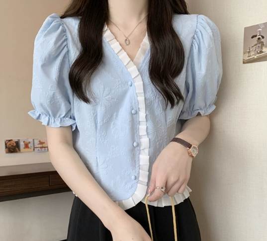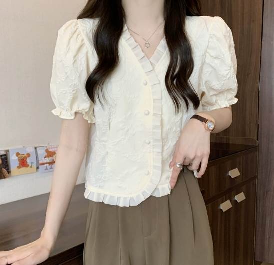 トップス シャツ ブラウス ショート丈 袖付き 半袖 パフスリーブ 襟なし Vネック 前開き かわいい 大人可愛い きれいめ シンプル 大人 上品 おしゃれ かっこいい レトロ 大人女子 こなれ感 キュート ガーリー 個性的 主役級 存在感 無地 春 夏 10代 20代 レディース 女性用 ママ 学生 通学 デート お出かけ 女子会 お泊まり 休日 リゾート 旅行 ホテル ショッピング アウトドア イベント レストラン 着回し 普段使い 重ね着 S M L ファッション コーデ スタイル ゆったり