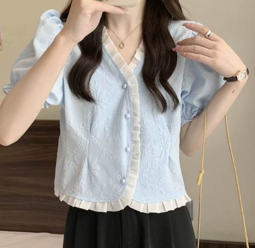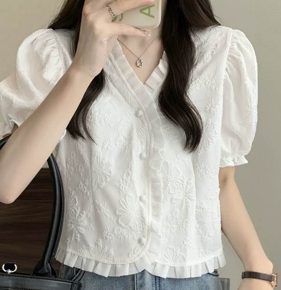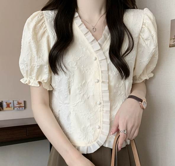 袖付き半袖で、パフスリーブがフェミニンな印象を与え、 Vネックと前開きがきちんと感を演出します。