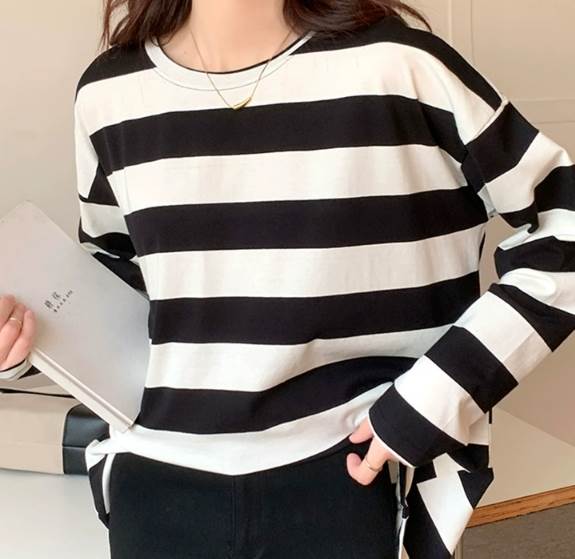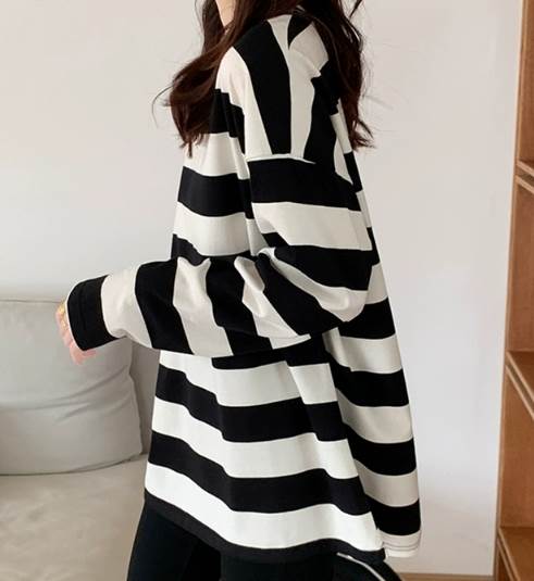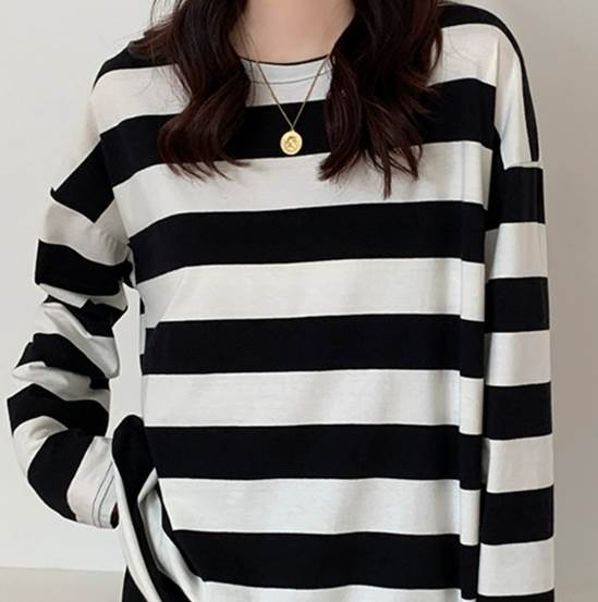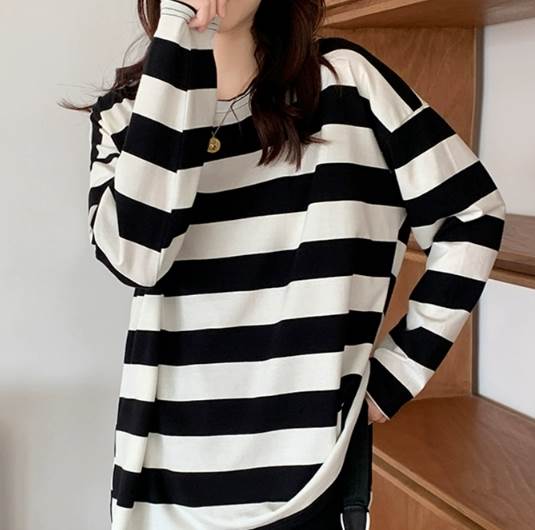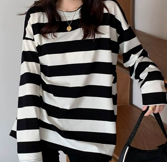 シックなボーダー柄が大人可愛い長袖Tシャツ。お尻がすっぽりと隠れるロング丈なので体型の悩みもふんわりとカバーしてくれます。シンプルなデザインだからこそ着回し力抜群。デニムを合わせても可愛いですし、シフォンスカートを合わせても◎