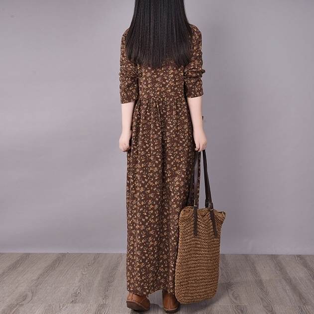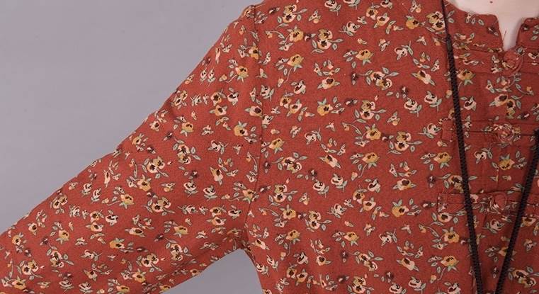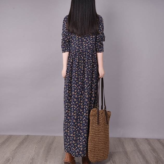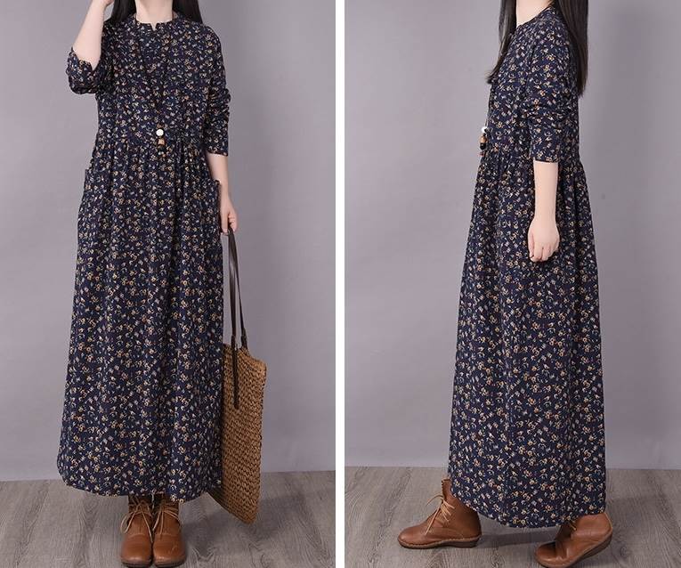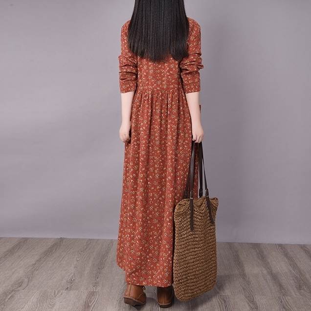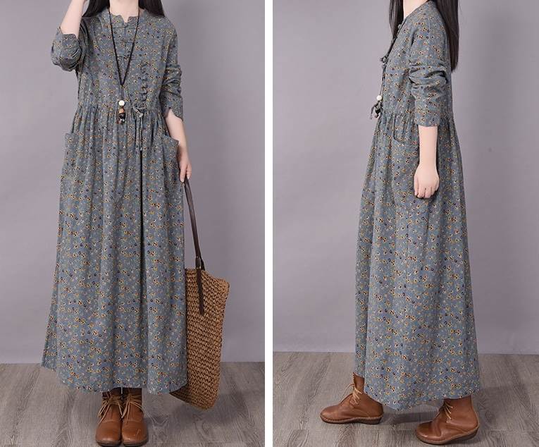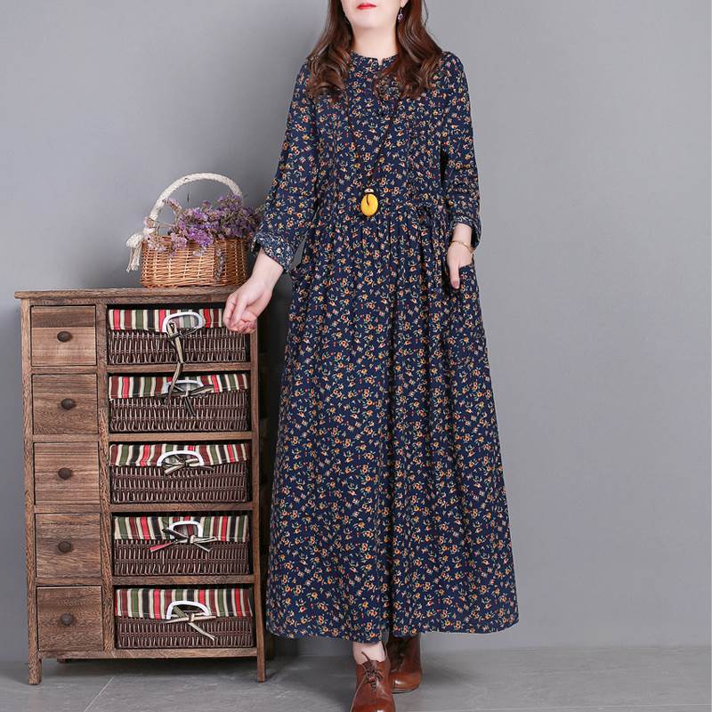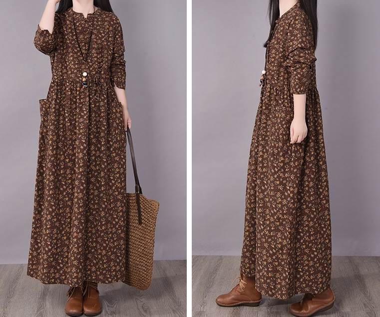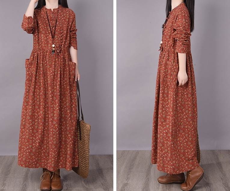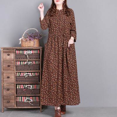 ワンピース ロング丈 袖あり 長袖 ラウンドネック 襟なし ルーズ Aライン 裾ワイド ハイウエスト プルオーバー 綿 コットン 大人可愛い きれいめ シンプル カジュアル 大人 上品 お洒落 かっこいい レトロ 大人女子 こなれ感 ラフ 個性的 クール モード系 エレガント モダン 主役級 存在感 とろみ感 抜け感 花柄 秋 冬 20代 30代 40代 レディース デート お出かけ 女子会 お泊まり 韓国系 オルチャン トレンド 流行 M L XL 2XL 3XL レッド ブラウン グレー ネイビー