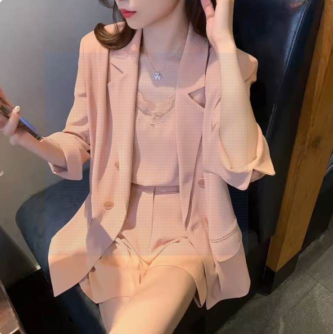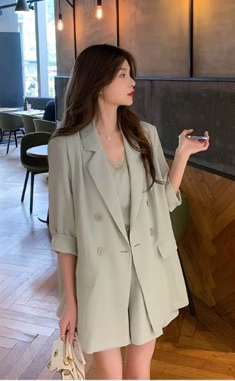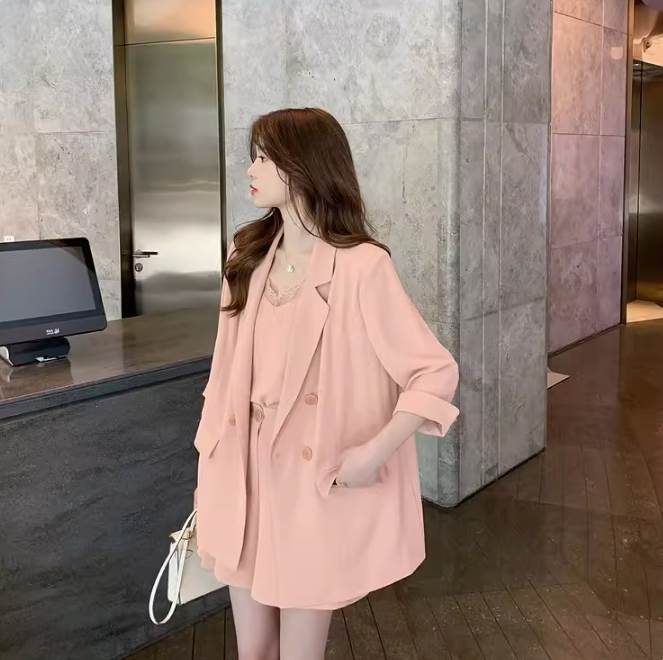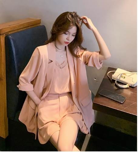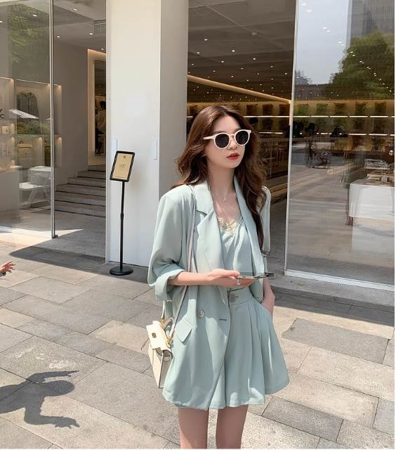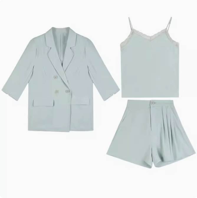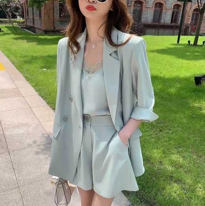 3点セット レディース トップス ジャケット ボトムス スーツ セットアップ テーラードジャケット ショートパンツ ショート 7分袖 キャミソール きれいめ おしゃれ こなれ感 とろみ感 抜け感 無地 春 夏 秋 OL デート 旅行 レストラン 女子会 バカンス ホテル ショッピング 着回し S M L ブラック ピンク グリーン