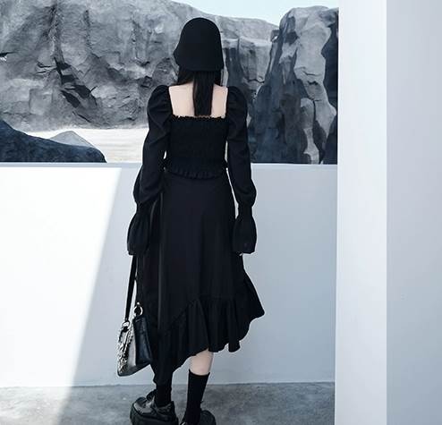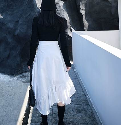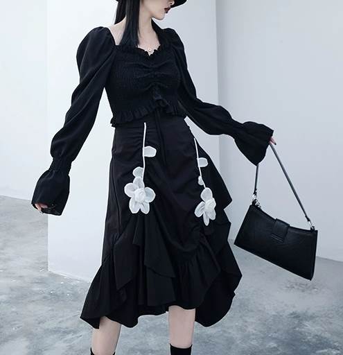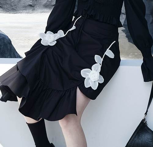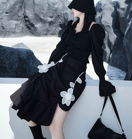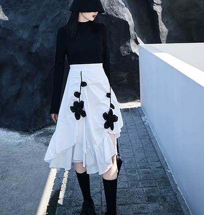 シンプルなデザインながらも、アシンメトリーの裾や花模様のプリントなどで個性をプラスしています。