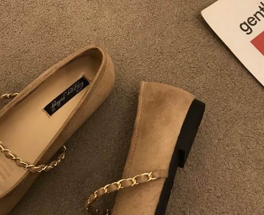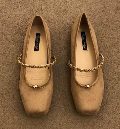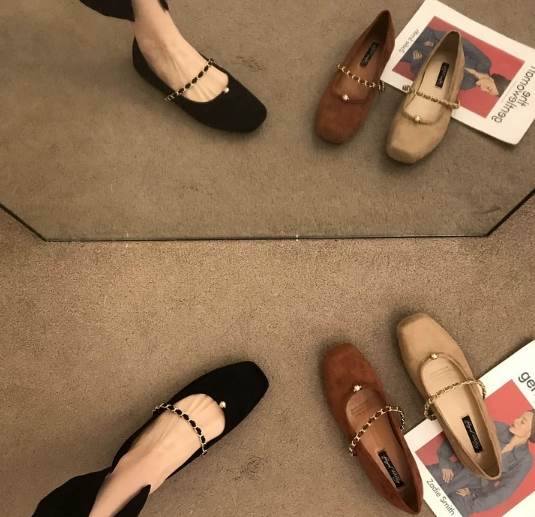 シックなカラーが大人可愛いスリッポン。ヒールの高さは1センチと低いのでたくさん歩く日にも重宝します。落ち着いたカラーによく合うゴールドのストラップとワンポイントの飾りがいいアクセントになっていておしゃれ。柄物のアイテムを合わせても可愛いです。