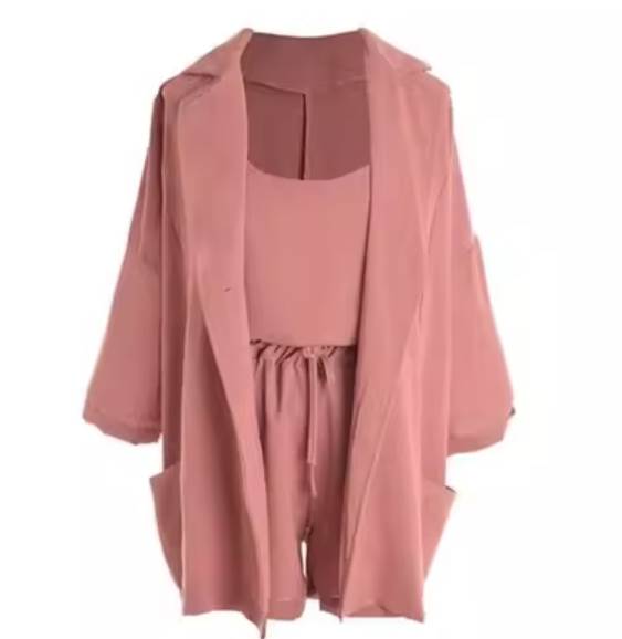 トップス ボトムス アウター セットアップ ジャケット キャミソール ショートパンツ ミニ 七分袖 襟付き ルーズ ワイド シフォン 大人可愛い きれいめ おしゃれ 大人女子 こなれ感 ルーズ とろみ感 抜け感 無地 春 夏 秋 10代 20代 30代 40代 女性用 ママ OL 学生 デート お出かけ 女子会 リゾート 海 ガーデン レストラン ショッピング 着回し 韓国系 M L XL 2XL 3XL 4XL ダスティピンク 色展開 ブラック ブルー