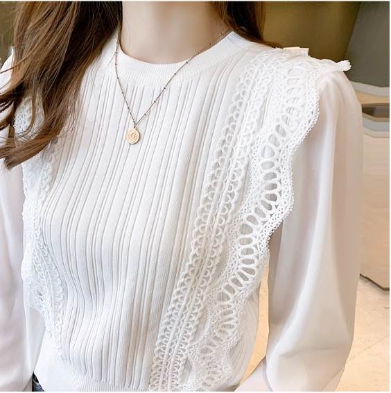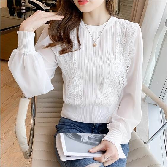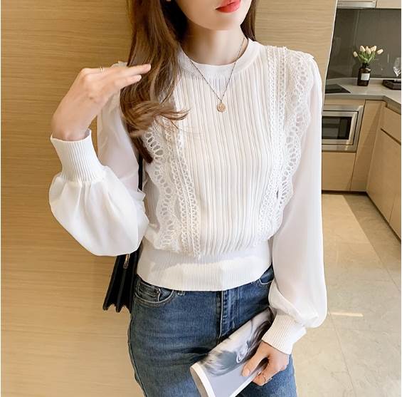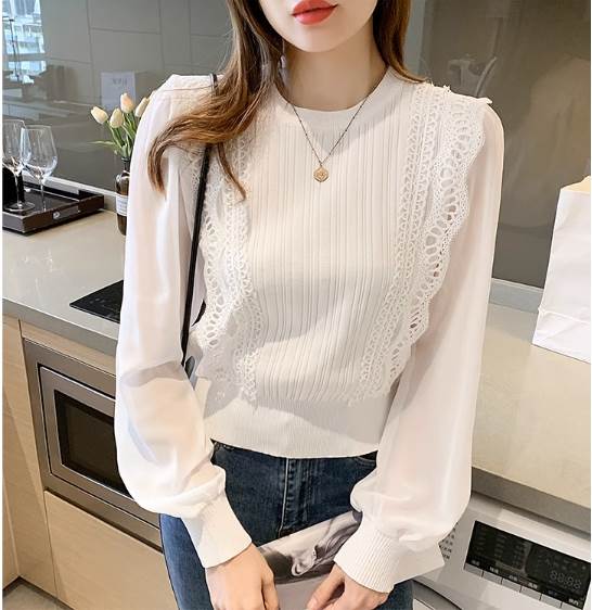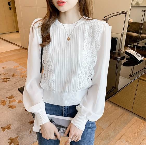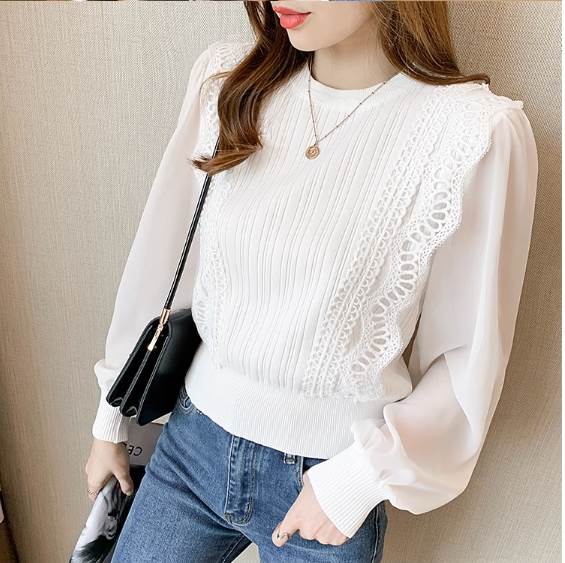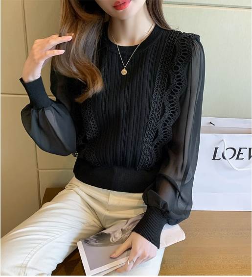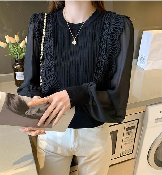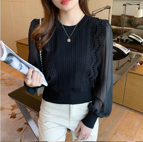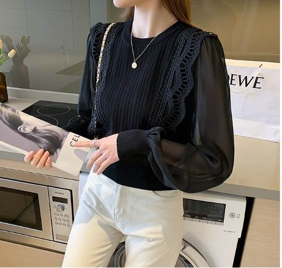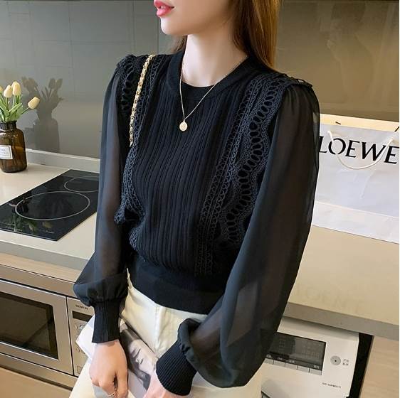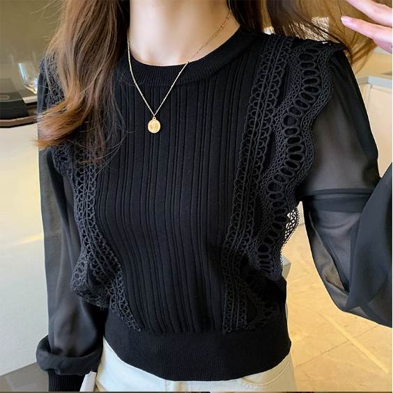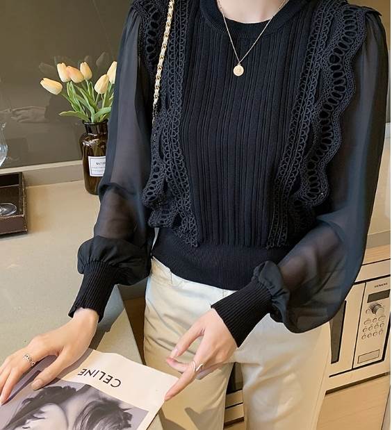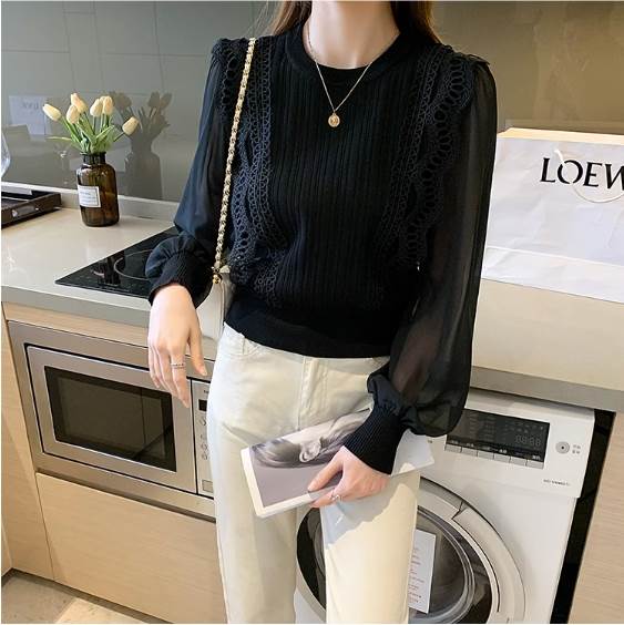 トップス プルオーバー ショート丈 長袖 ラウンドネック レース 透け感 大人可愛い きれいめ 上品 お洒落 大人女子 セクシー エレガント 無地 春 秋 10代 20代 30代 40代 50代 女性用 ママ オフィス OL 学生 通学 デート お出かけ 女子会 休日 旅行 ホテル レストラン ショッピング 韓国系 S M L XL ブラック ホワイト