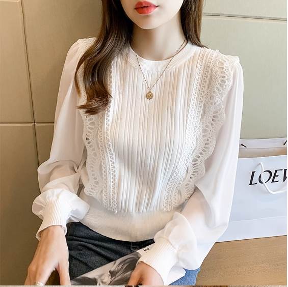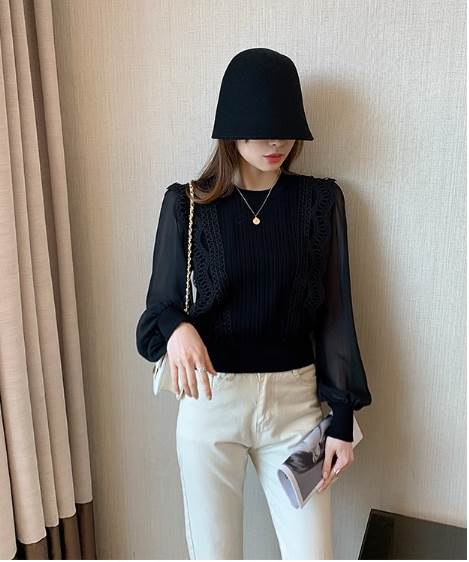 トップス プルオーバー ショート丈 長袖 ラウンドネック レース 透け感 大人可愛い きれいめ 上品 お洒落 セクシー エレガント 無地 春 秋 30代 40代 黒 白 切り替えデザイン レディース