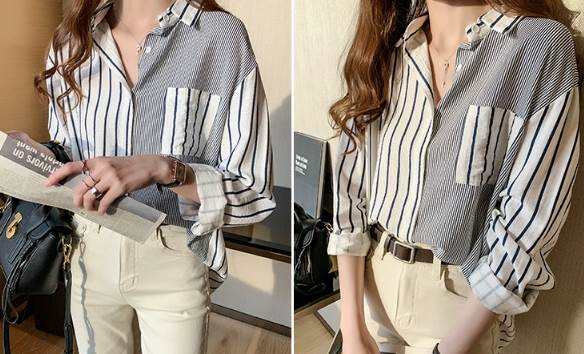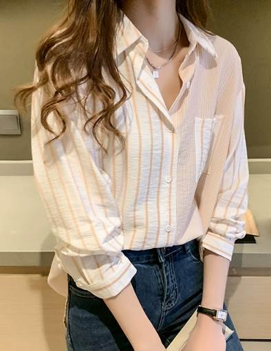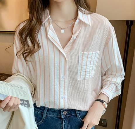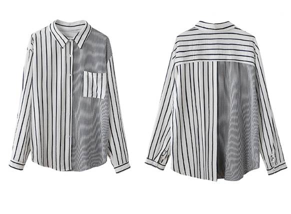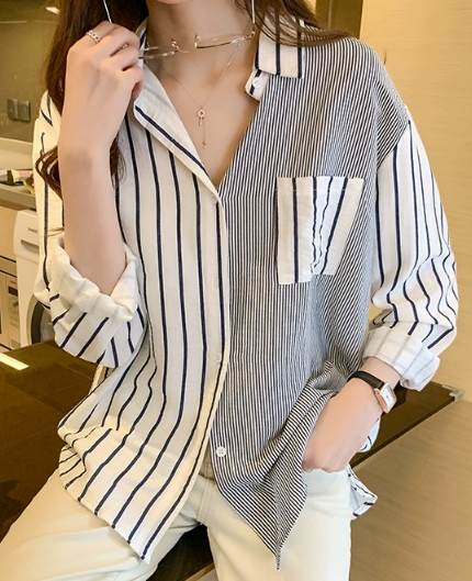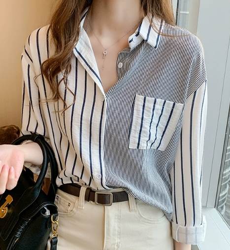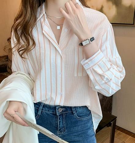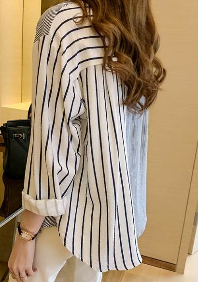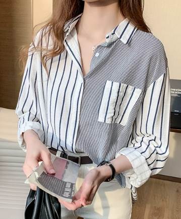 一定ではない様々な細さの縦ラインがおしゃれなストライプ柄長袖シャツ。遊び心のある爽やかなアイテムです。オーバーサイズなので男性の物を借りたかのようなだぼっと感もキュート。デニム生地との相性が抜群です。ネックレスを付けて女性らしさをプラスしても◎