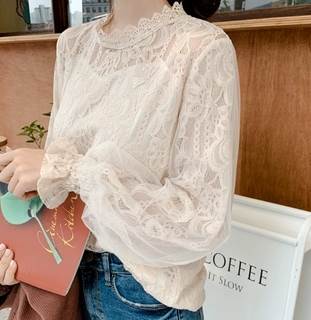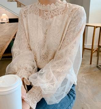 レース トップス プルオーバー インナー 長袖 バルーンスリーブ ハイネック ストレート チュール かわいい きれいめ カジュアル 大人 上品 おしゃれ こなれ感 存在感 柄 春 エレガント
