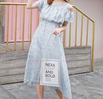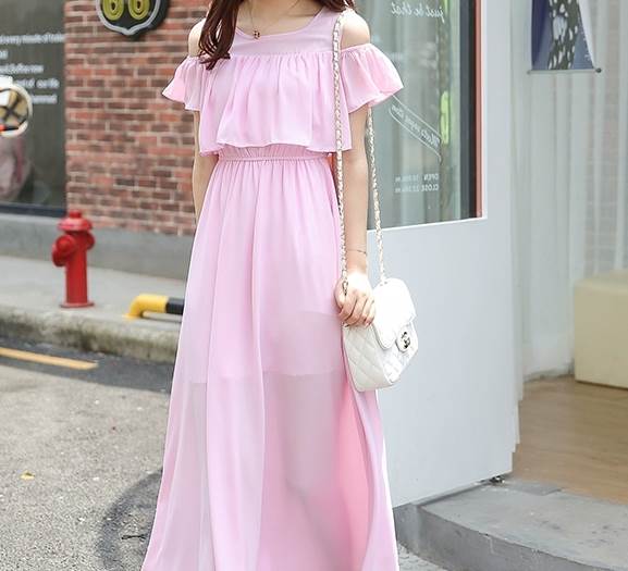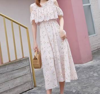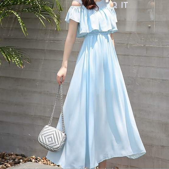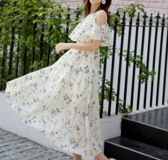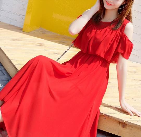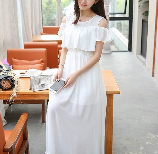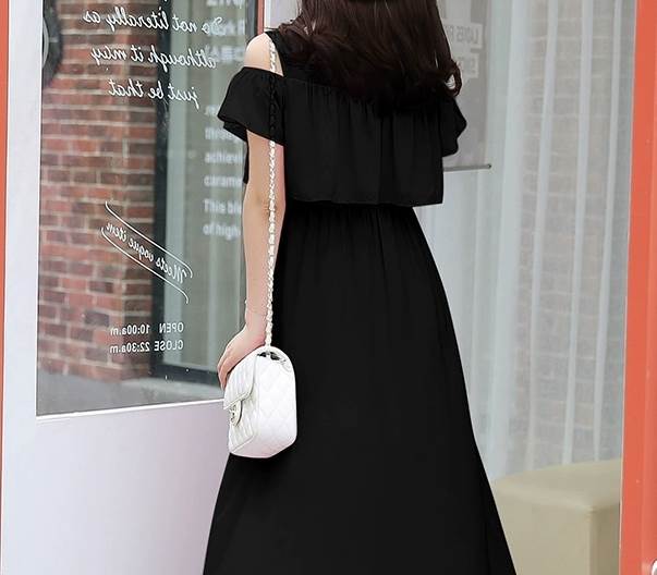オフショルダーデザインとミモレ丈の組み合わせが、女性らしいセクシーさと上品さを引き立てます。