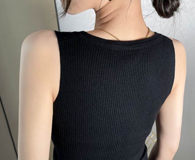 こちらの商品はノースリーブでVネックが女性らしい印象を与え、ワイドショルダーストラップが大人可愛い雰囲気を演出します。スリムなシルエットが、大人のきれいめスタイルにもぴったり。