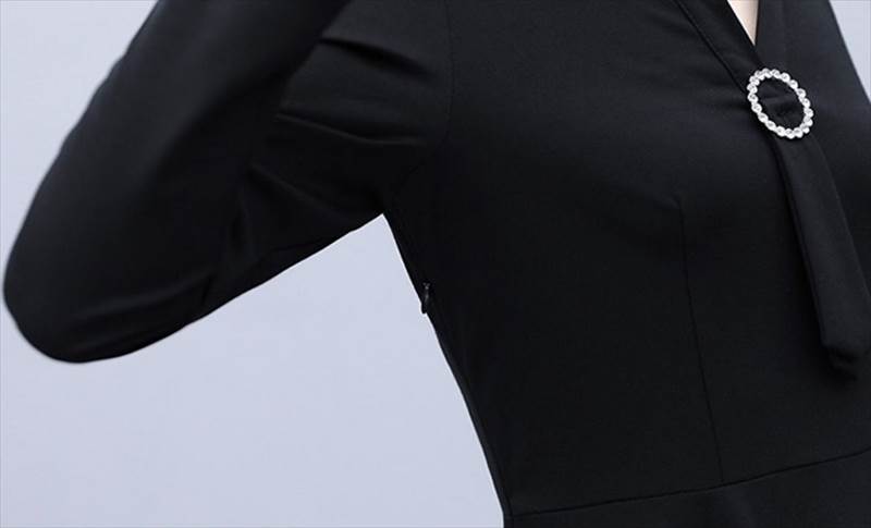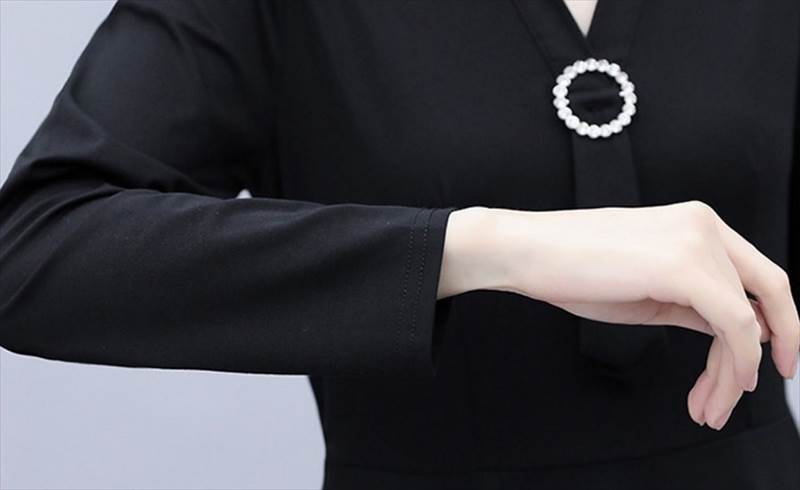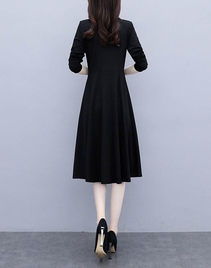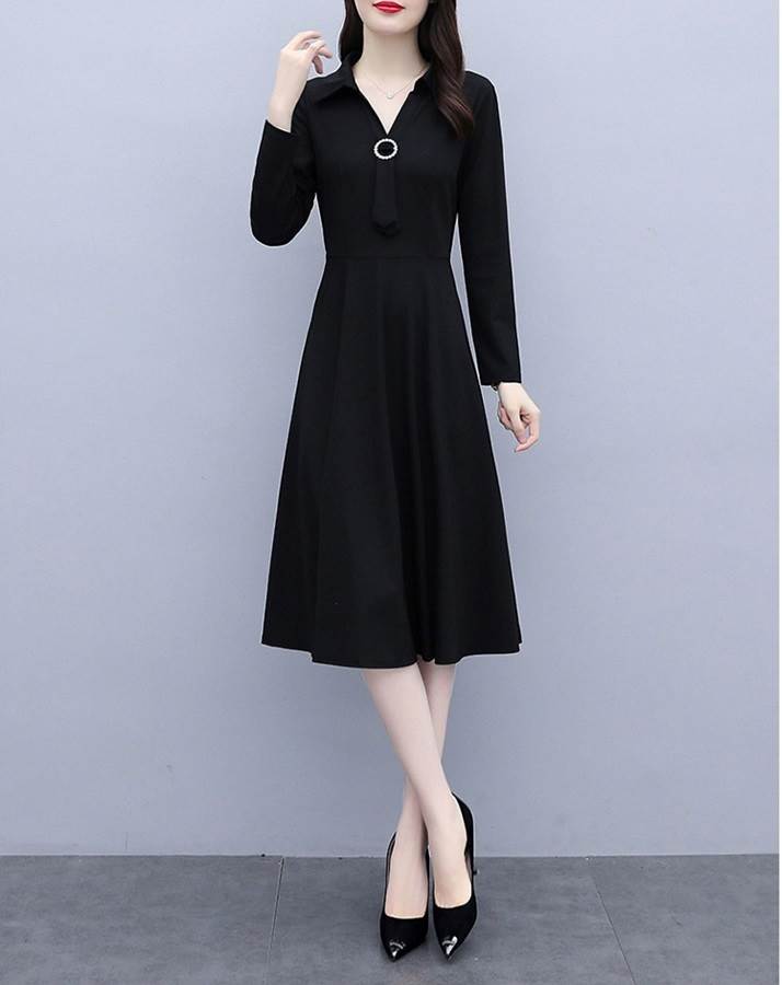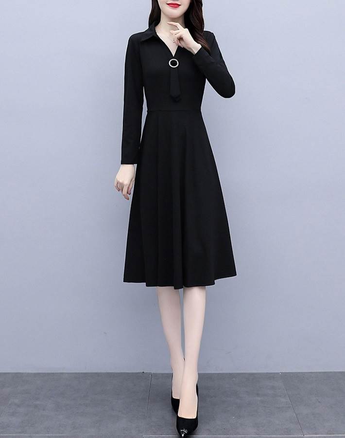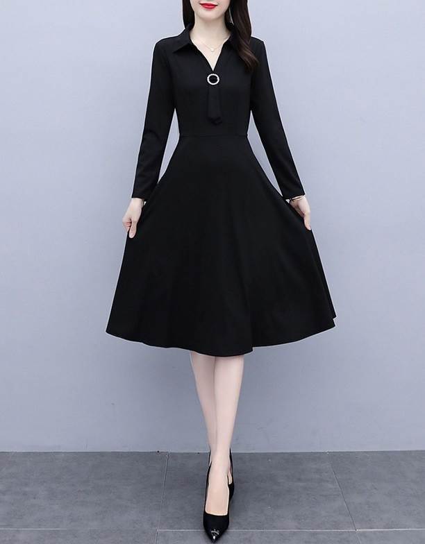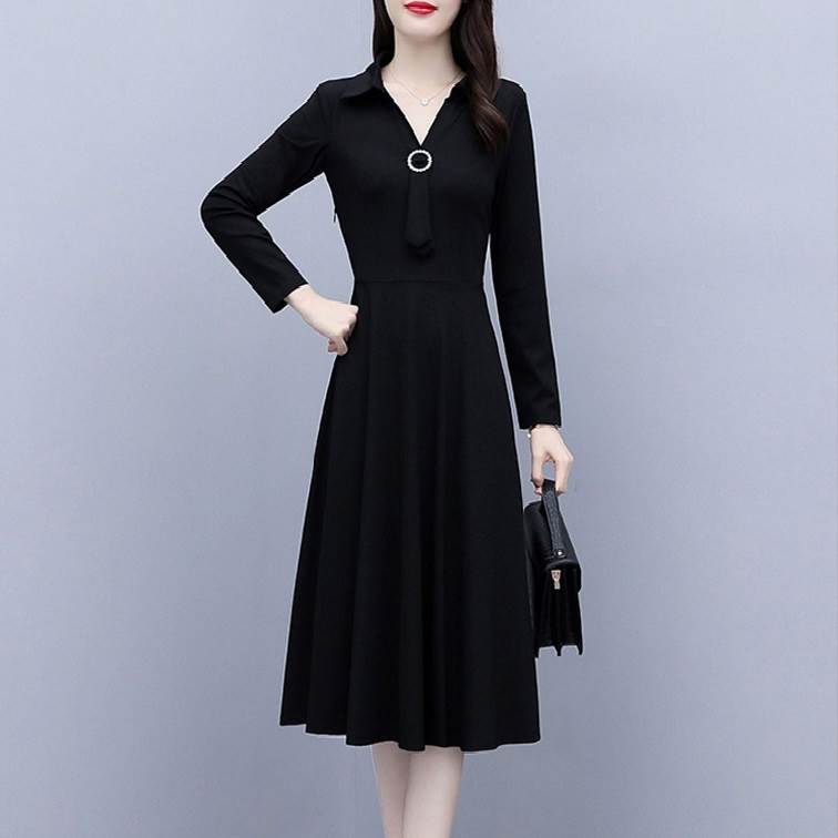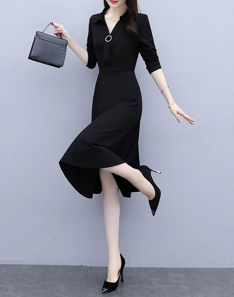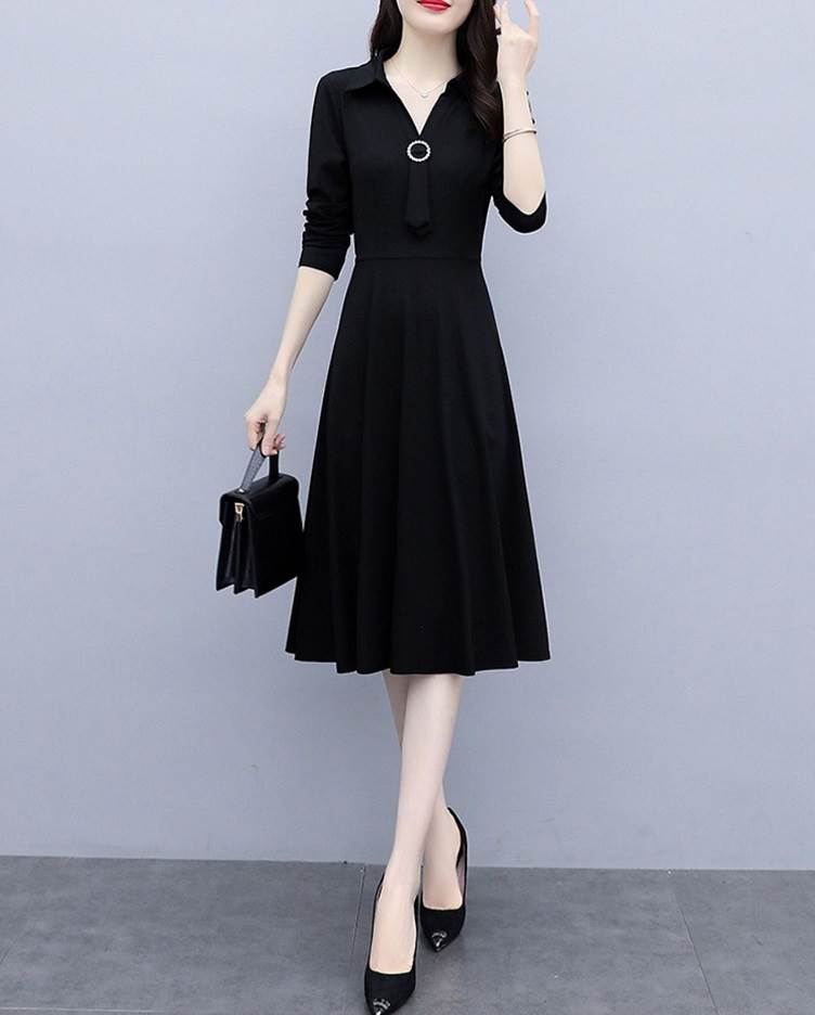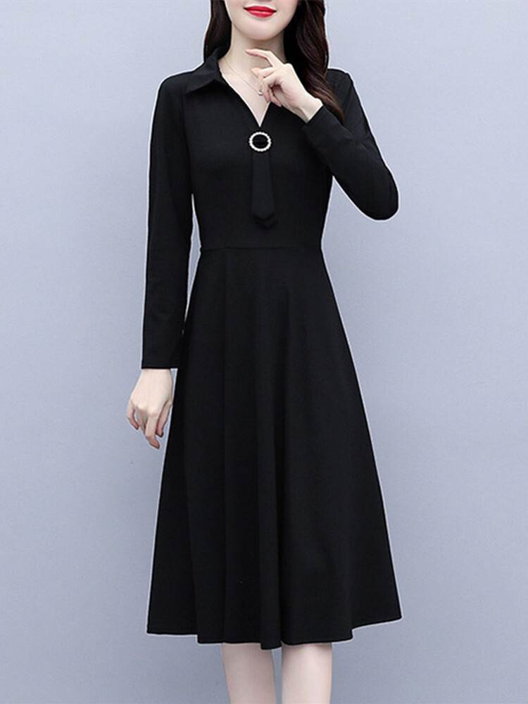 レディース ワンピース 膝丈 ミディアム 長袖 Vネック 襟付き フレア スリム Aライン かわいい 大人可愛い きれいめ シンプル 上品 おしゃれ レトロ 個性的 エレガント モダン 主役級 存在感 フォーマル おとな フェミニン 大人女子 無地 春 秋 発表会 授業参観 ママ オフィス ビジネス OL 通勤 デート お出かけ パーティー イベント 女子会 休日 高原 ホテル 発表会 婚活 韓国 コーデ 体型カバー モテ 清楚 定番 M L XL 2XL 3XL 4XL 5XL 大きいサイズ ブラック