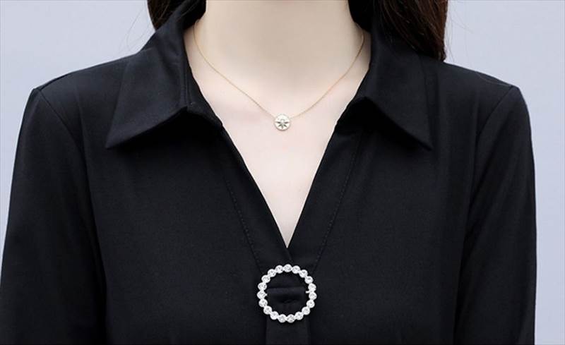 Vネックと襟付きのデザインが、洗練された女性らしさを引き立てます。