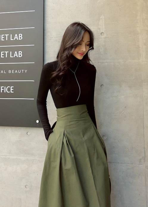 タック入りで上品なシルエットに。ボリュームのあるスカートなのでトップスはタイトなものと合わせるとメリハリのあるコーデに。