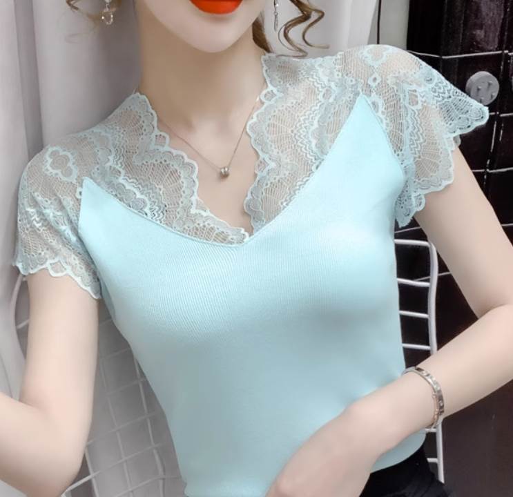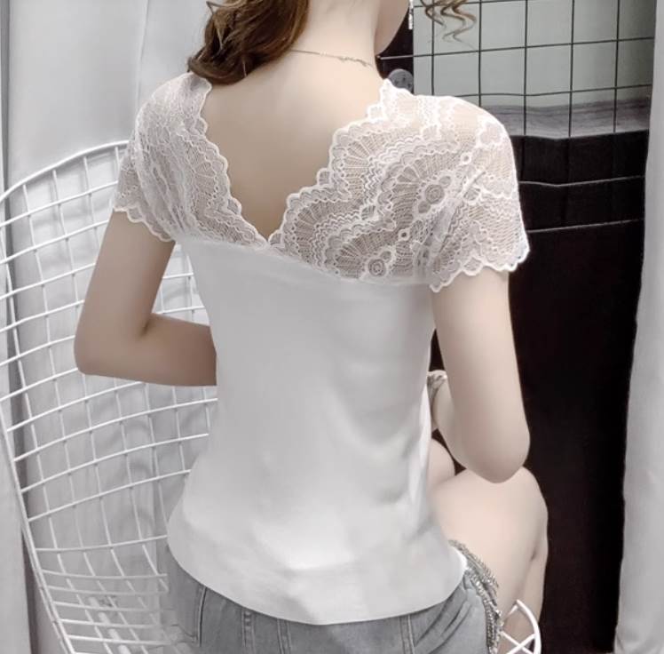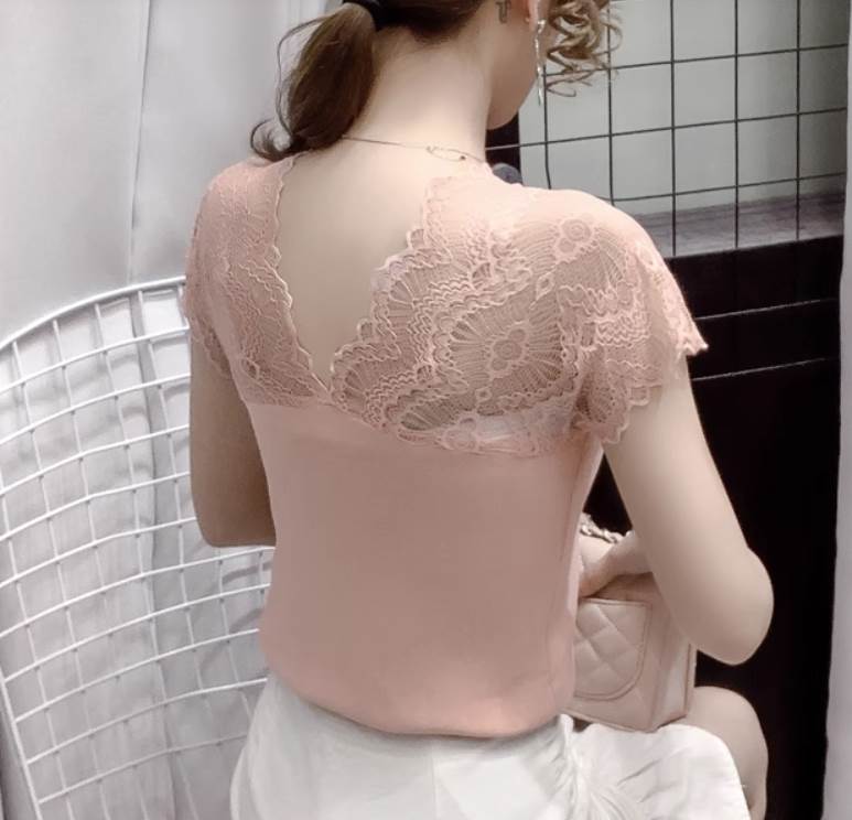 レディース トップス カットソー ミドル丈 半袖 Vネック タイト スリム 細身 レース バックコンシャス インナーとしても かわいい 大人可愛い きれいめ 上品 おしゃれ エレガント ラブリー キュート セクシー 無地 夏 デート お出かけ 休日 コーデ レイヤード モテ フリーサイズ 白 ホワイト 黒 ブラック ピンク ライトブルー