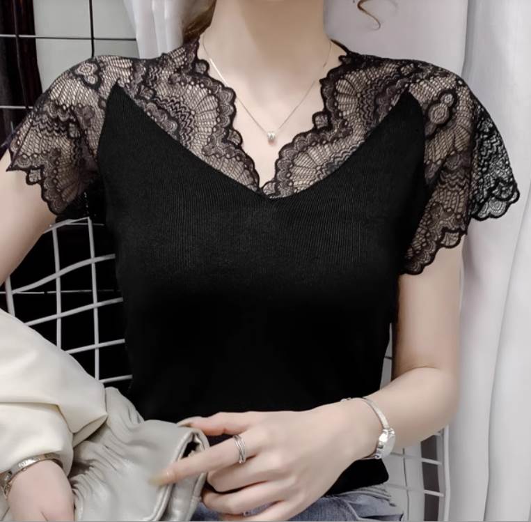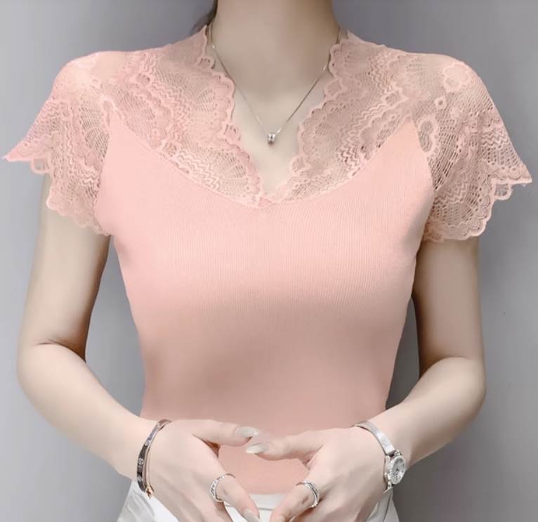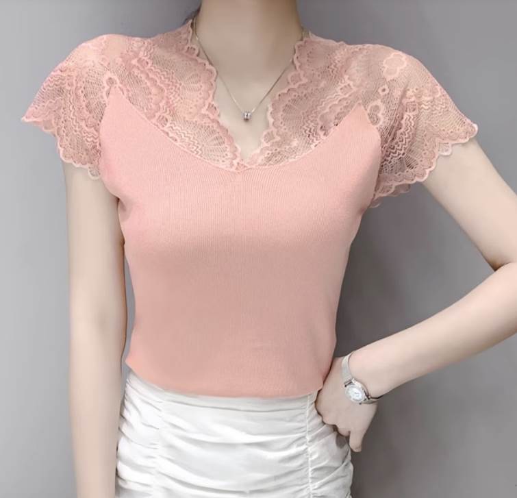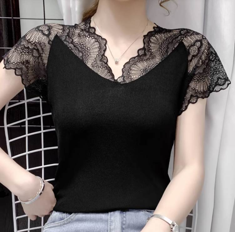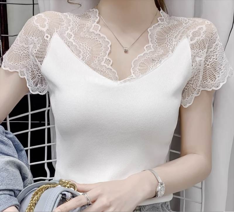 レディース トップス カットソー ミドル丈 半袖 Vネック タイト スリム 細身 レース バックコンシャス インナーとしても かわいい 大人可愛い きれいめ 上品 エレガント ラブリー キュ おしゃれ