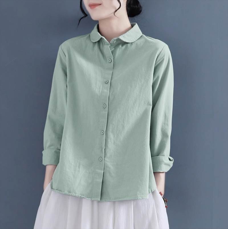 トップス シャツ ミドル丈 長袖 襟付き 丸襟 ストレート ボタン 前開き かわいい 大人可愛い きれいめ シンプル カジュアル おしゃれ お洒落 ラフ 無地 春 秋 10代 20代 30代 レディース デート お出かけ モテ ファッション コーデ サイズ S M L XL 2XL 色展開 ホワイト ブラック グリーン ピンク ベージュ ライトブルー くすみカラー ライトグリーン