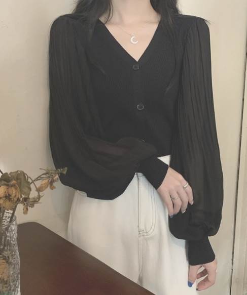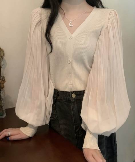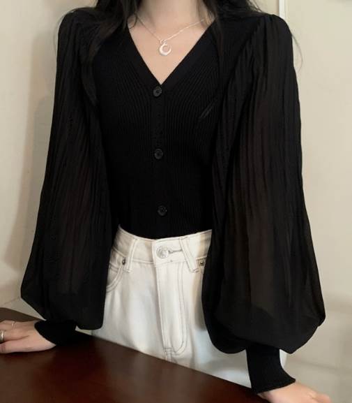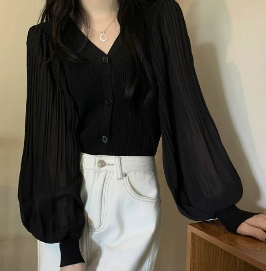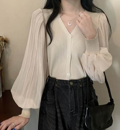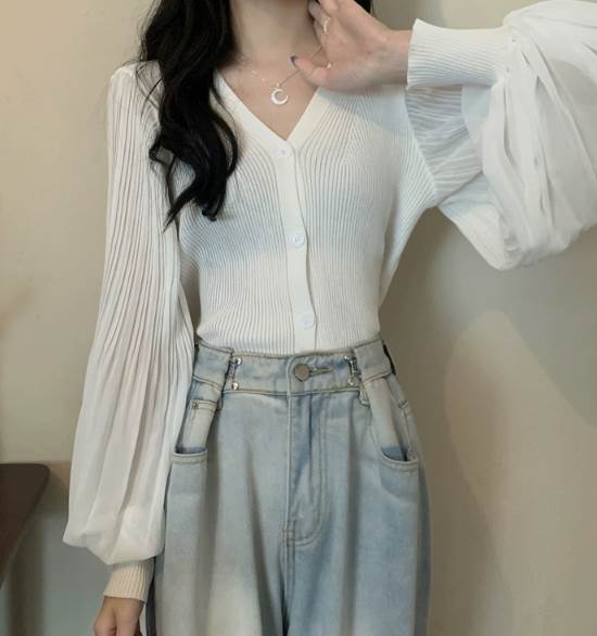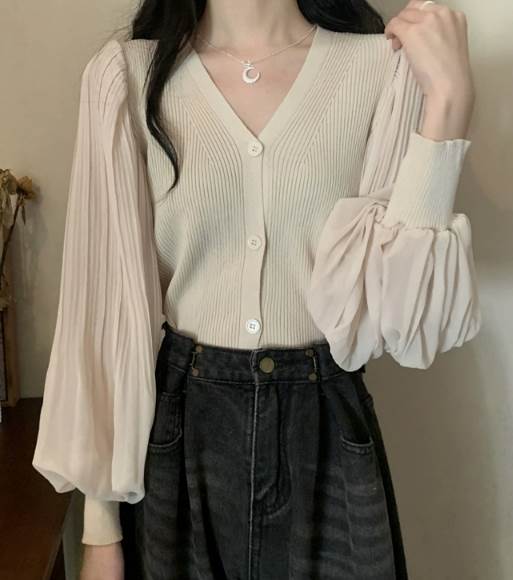 ぽわんとしたボリュームのある袖が可愛い長袖カーディガン。腕部分をふっくらとさせることで華奢見え効果が期待できます。Vネックなのでデコルテラインを綺麗に見せてくれるのも嬉しいポイント。ネックレスとの相性も抜群です。