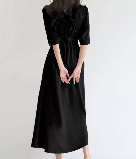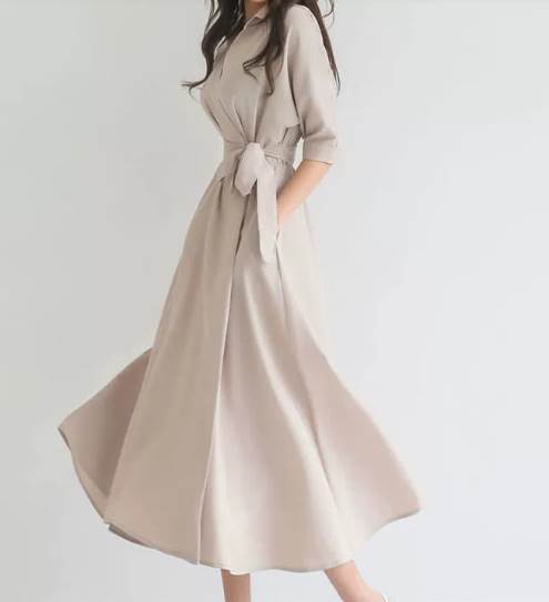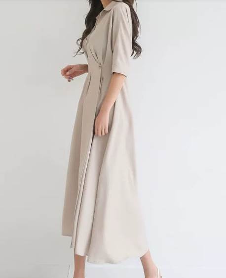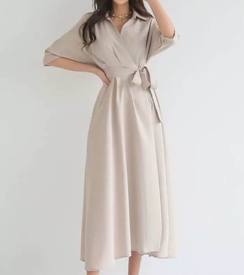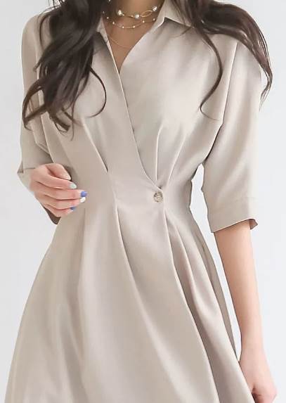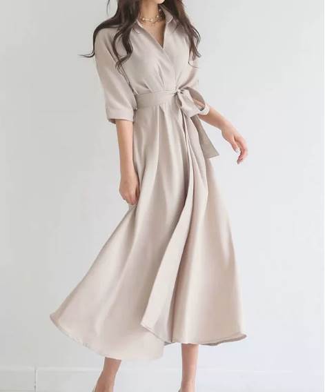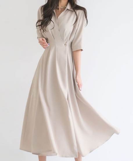 レディース ワンピース ミモレ 半袖 襟付き 角襟 フレア スリム 細身 Aライン ウエストマーク ハイウエスト 異国風 切り替えデザイン かわいい 大人可愛い シンプル カジュアル 上品 きれいめ