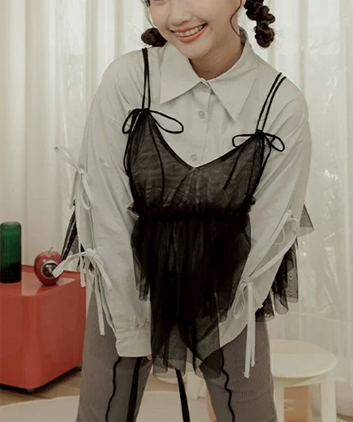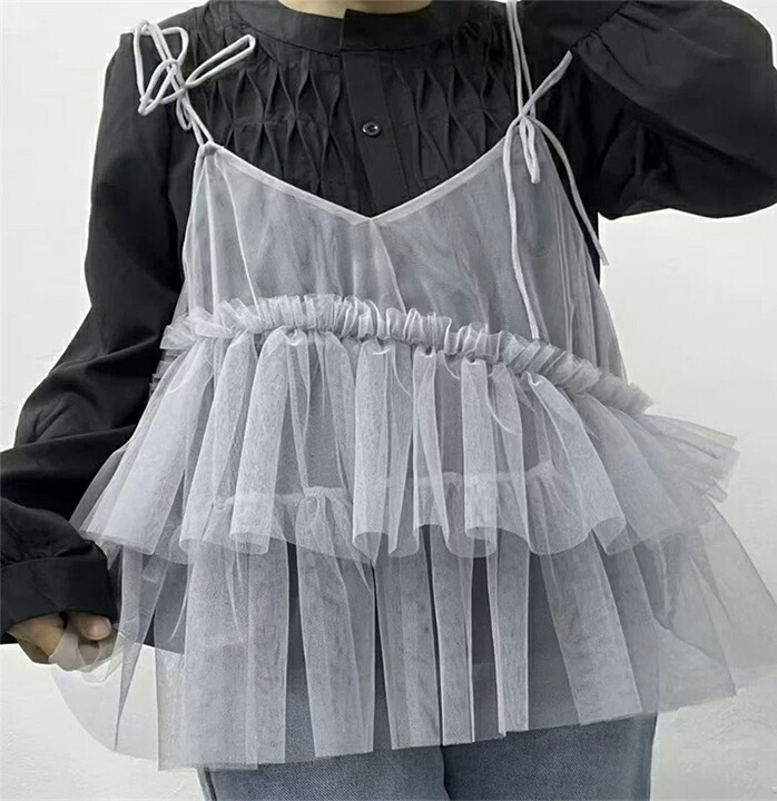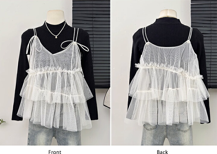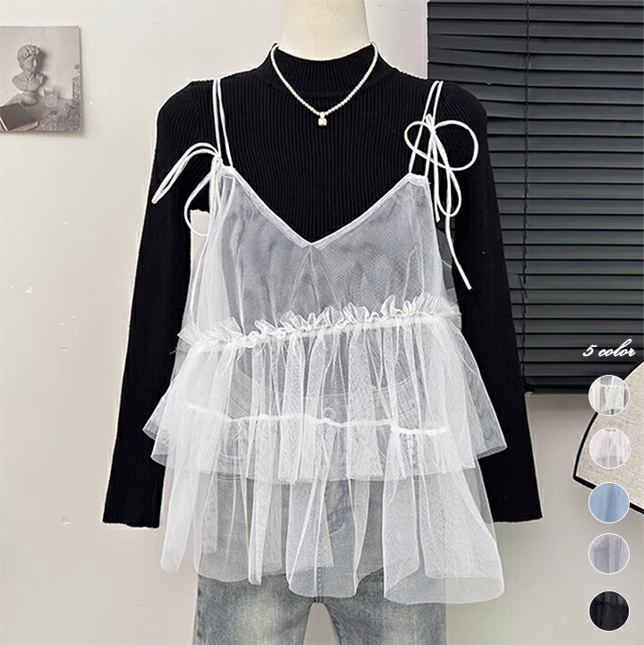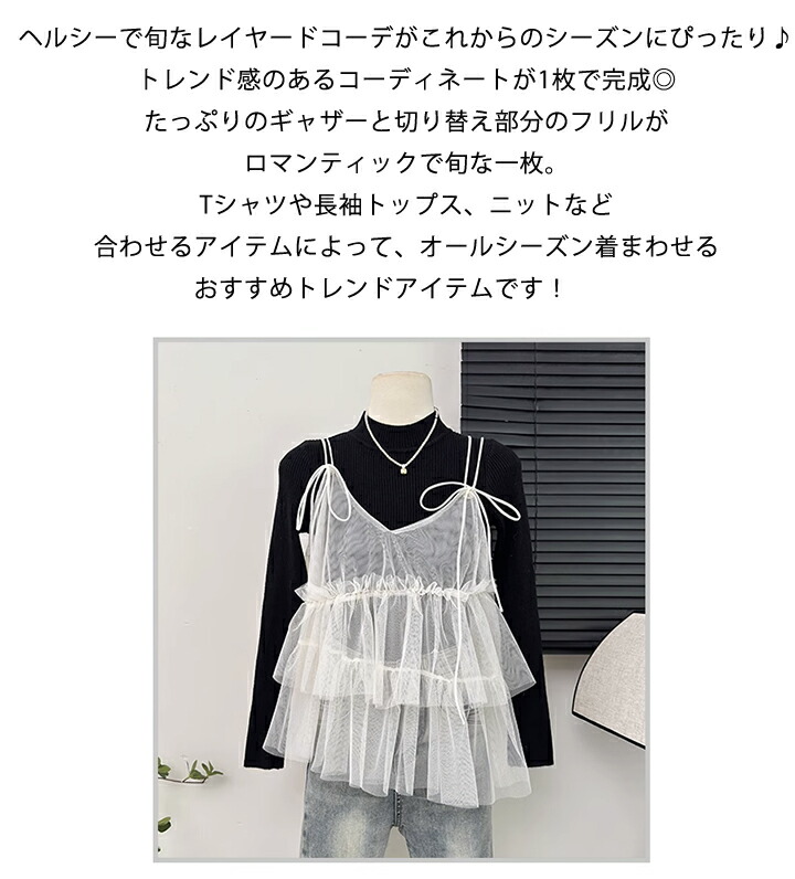 チュールキャミトップス フリルチュール トップス キャミソール 通販 ホワイト ベージュ ブルー グレー ブラック