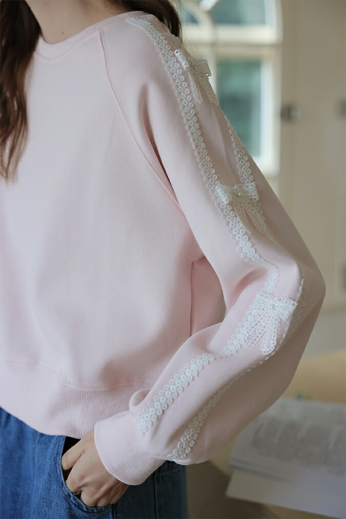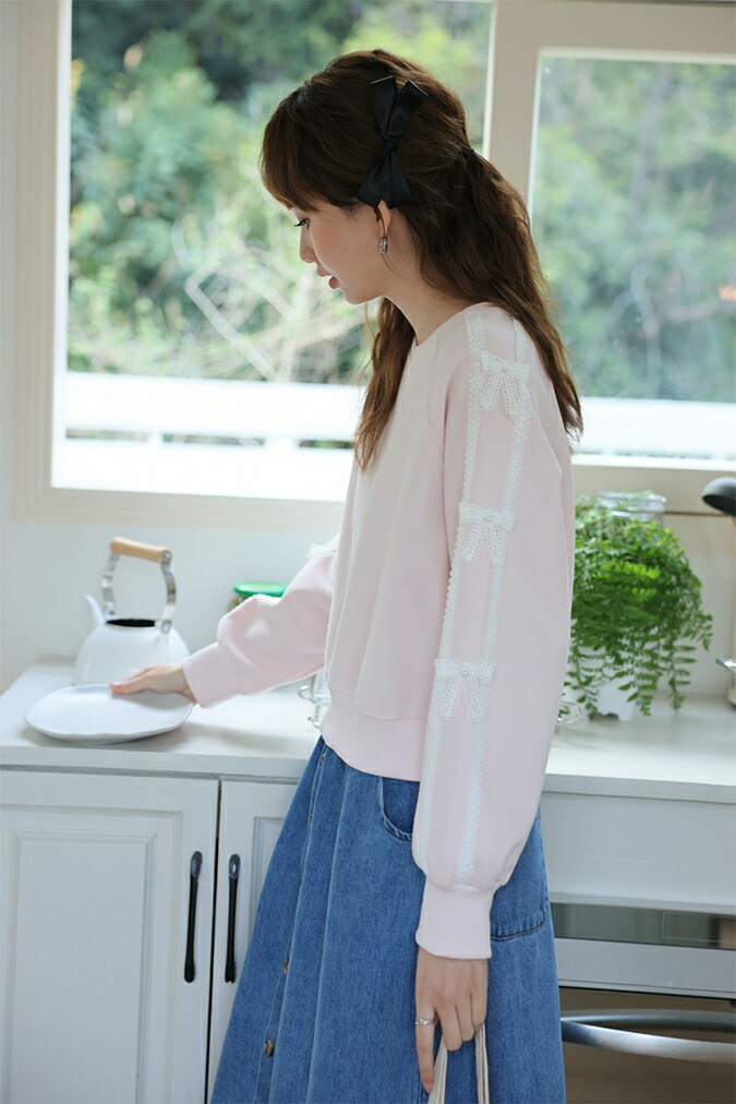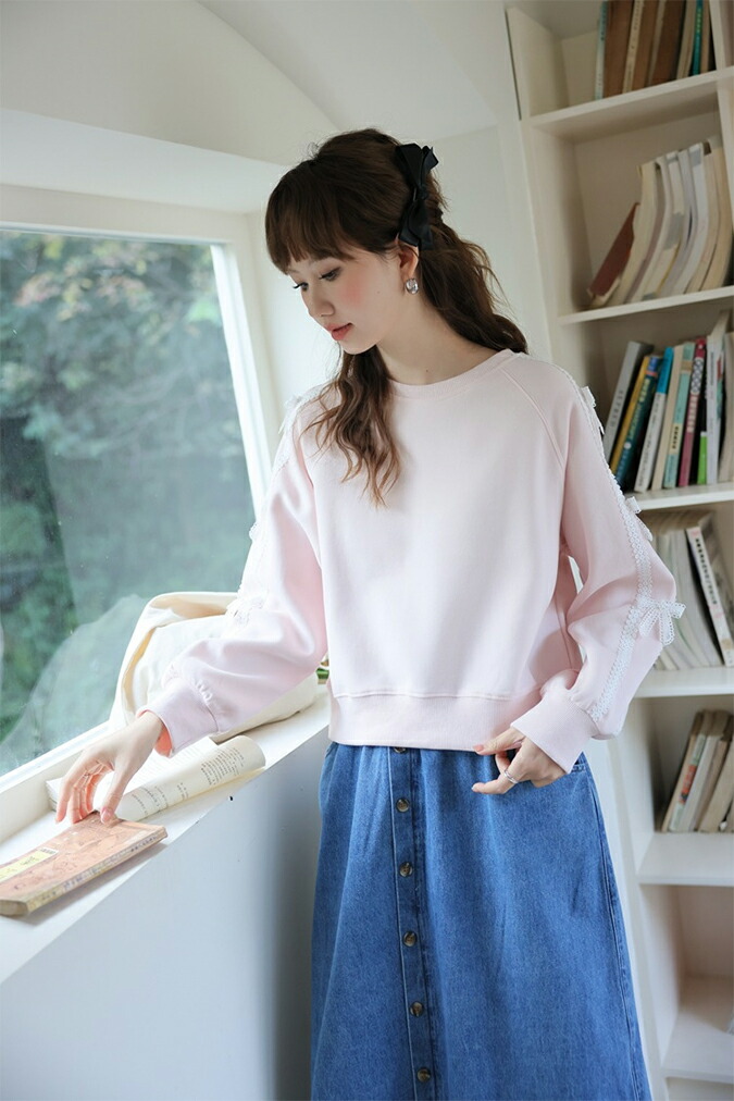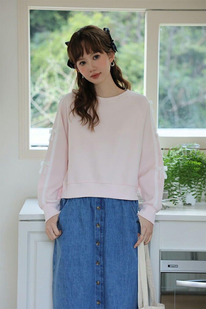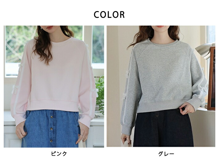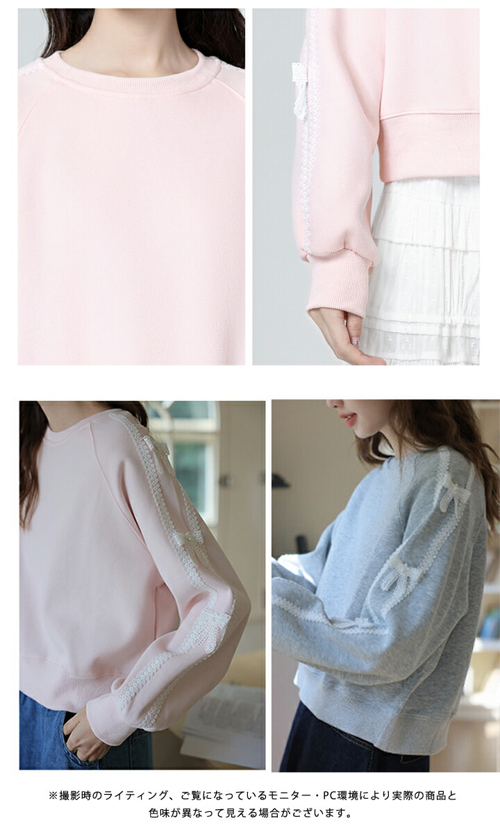 袖レースライン&リボンスウェット トレ トップス スウェット トレーナー 通販 S M L ピンク グレー